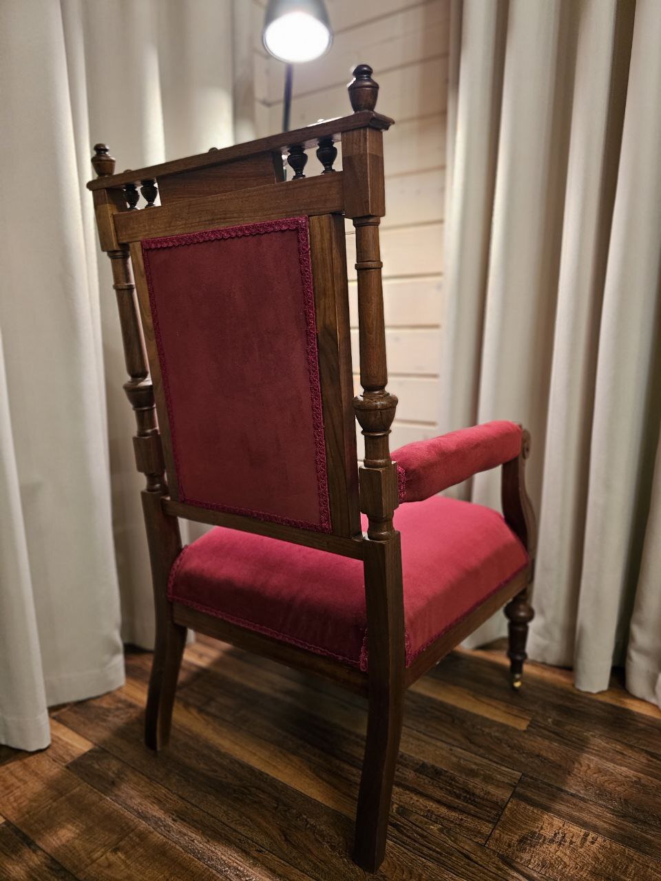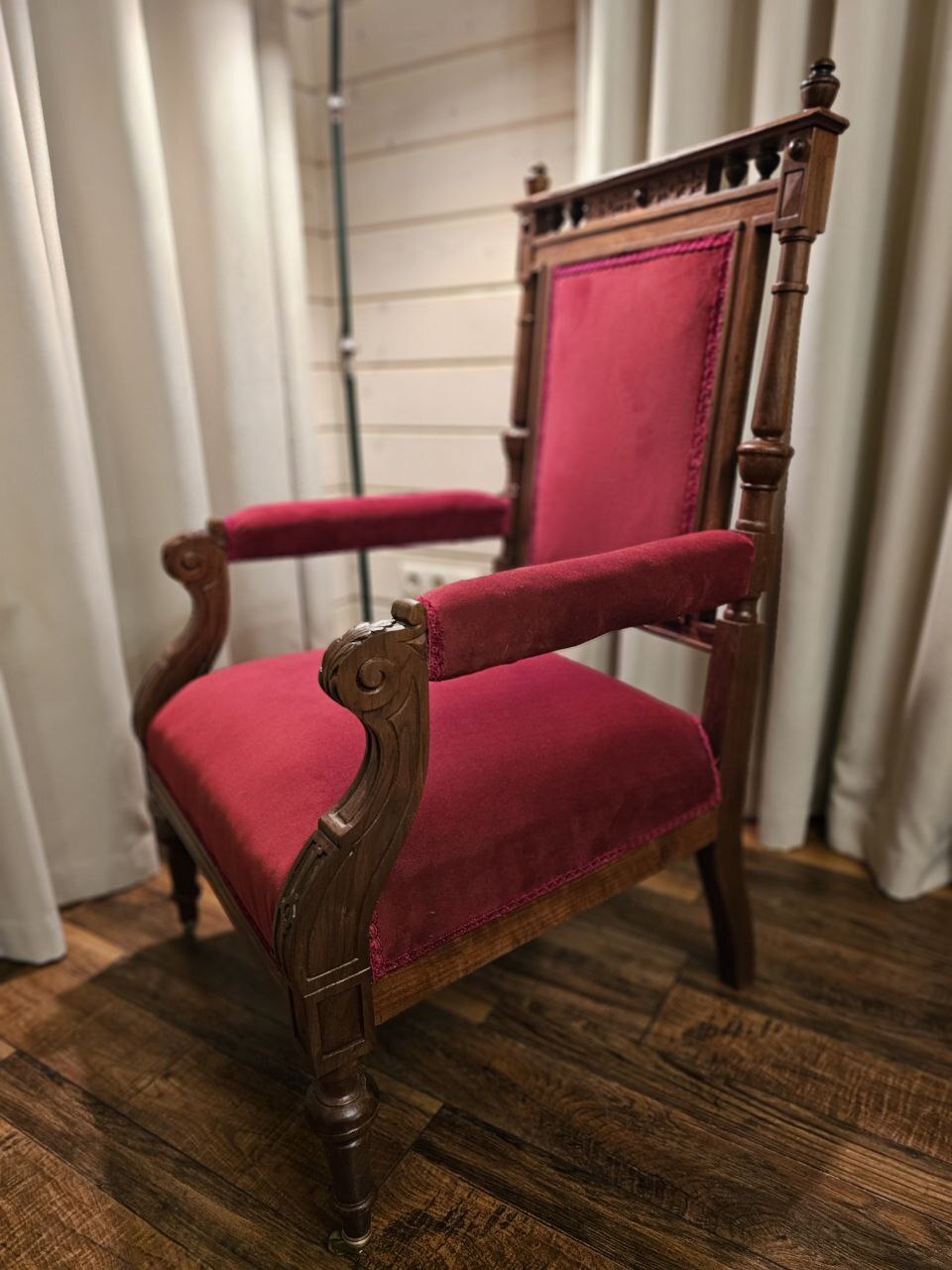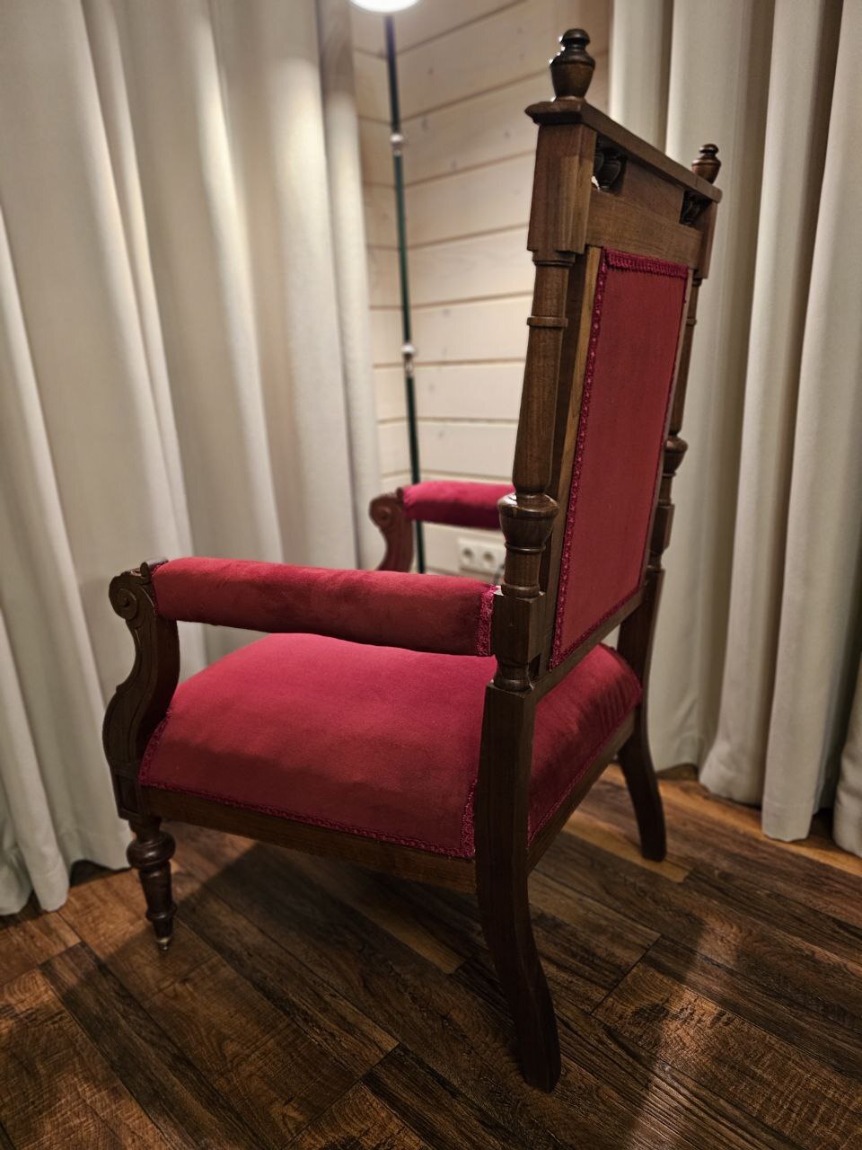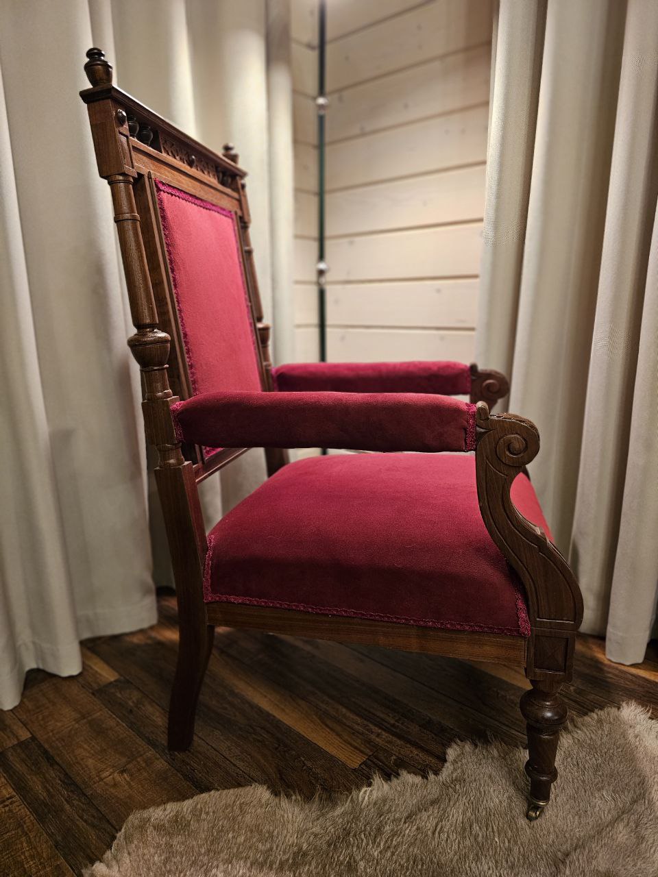 Антикварное кресло 19 век, после аккуратной реставрации. Реставрация по аутентичной технологии, антикварные пружины, водоросли, обивка европейской тканью – красный бархат. Передние ножки на колесиках. При реставрации обнаружены старинные отметки, автограф автора.