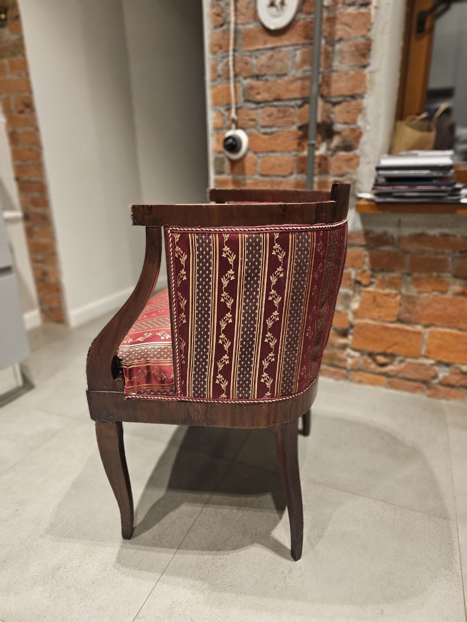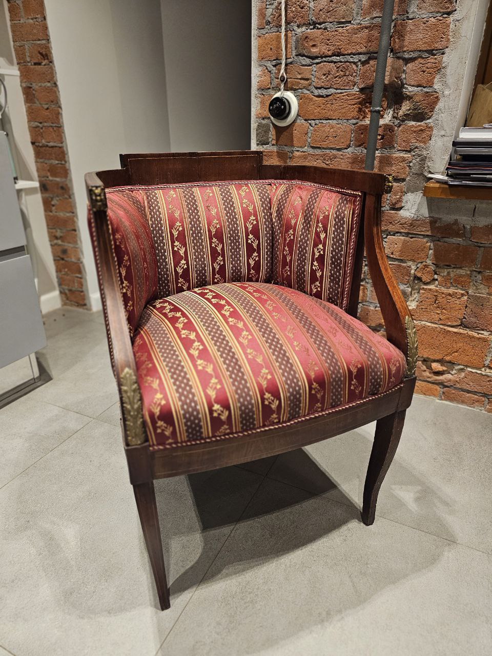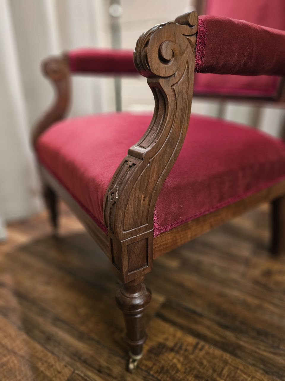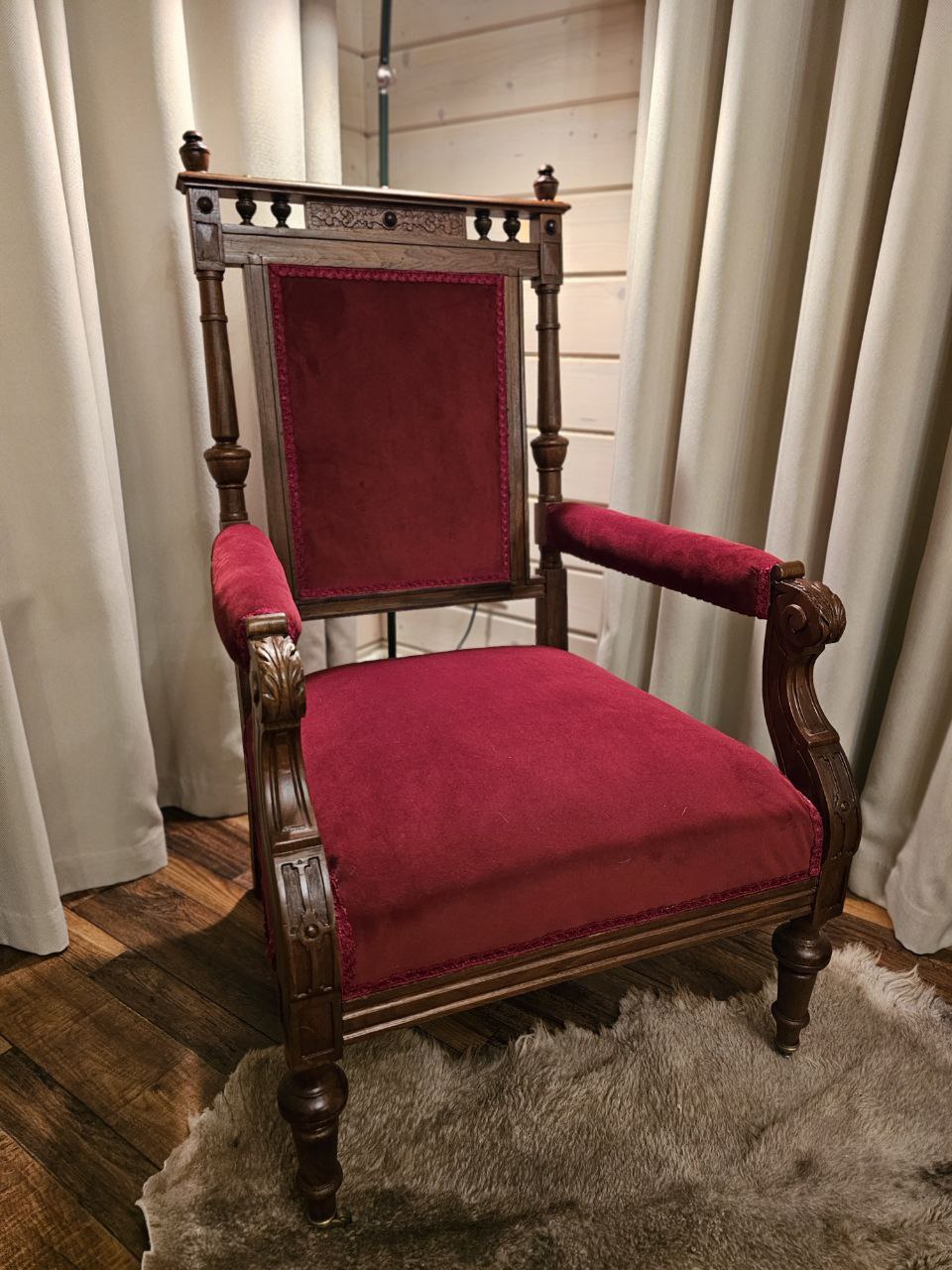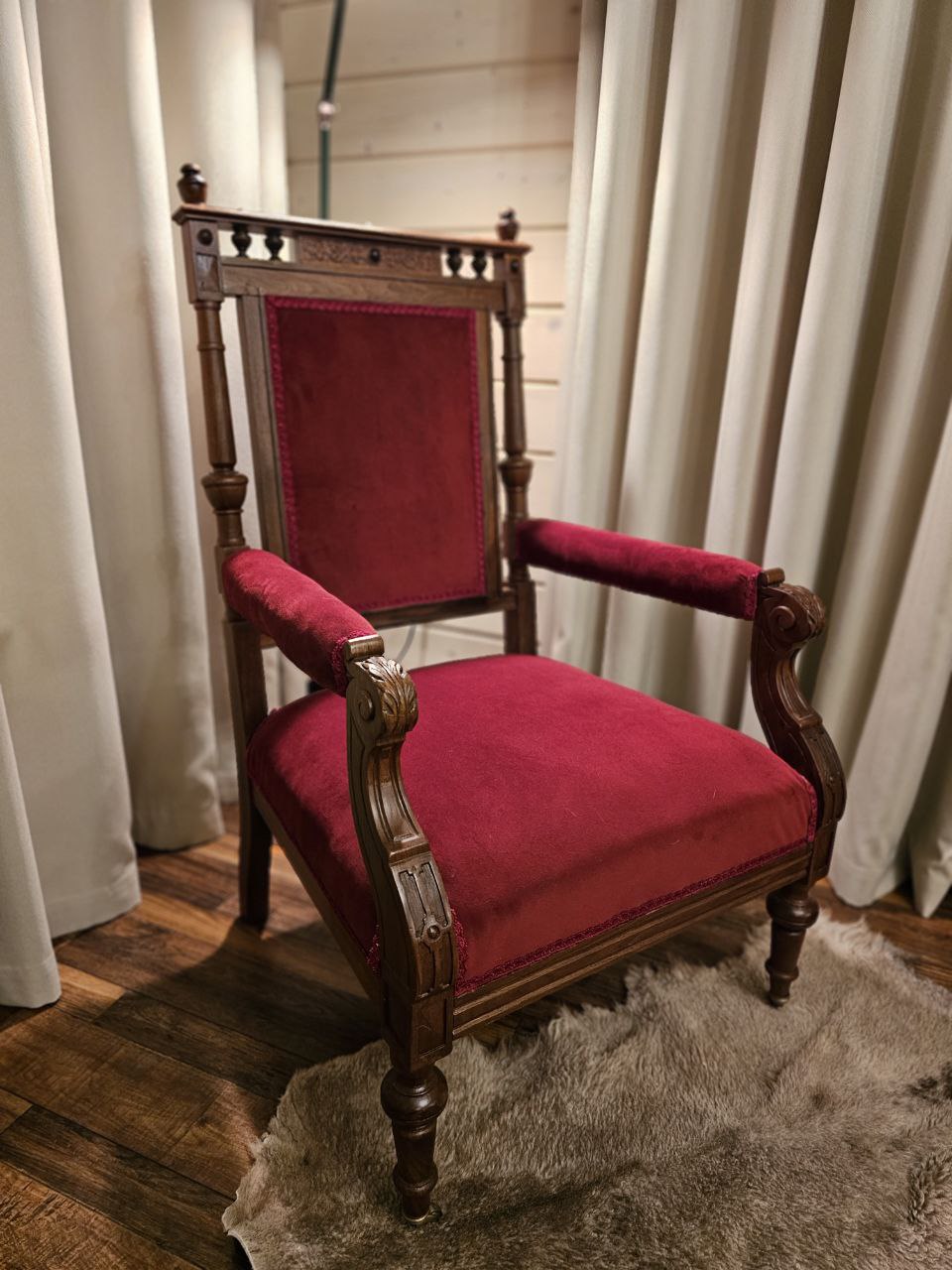 Антикварное кресло 19 век, после аккуратной реставрации. Реставрация по аутентичной технологии, антикварные пружины, водоросли, обивка европейской тканью – красный бархат. Передние ножки на колесиках. При реставрации обнаружены старинные отметки, автограф автора.