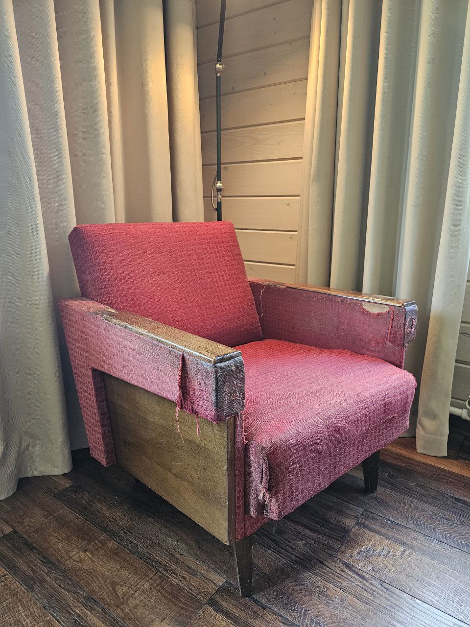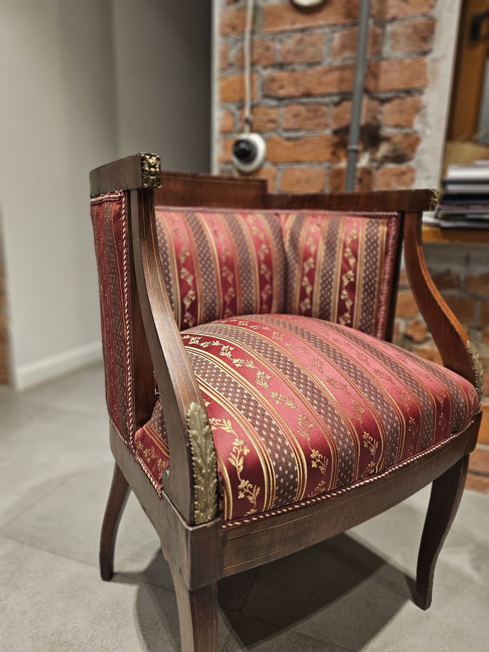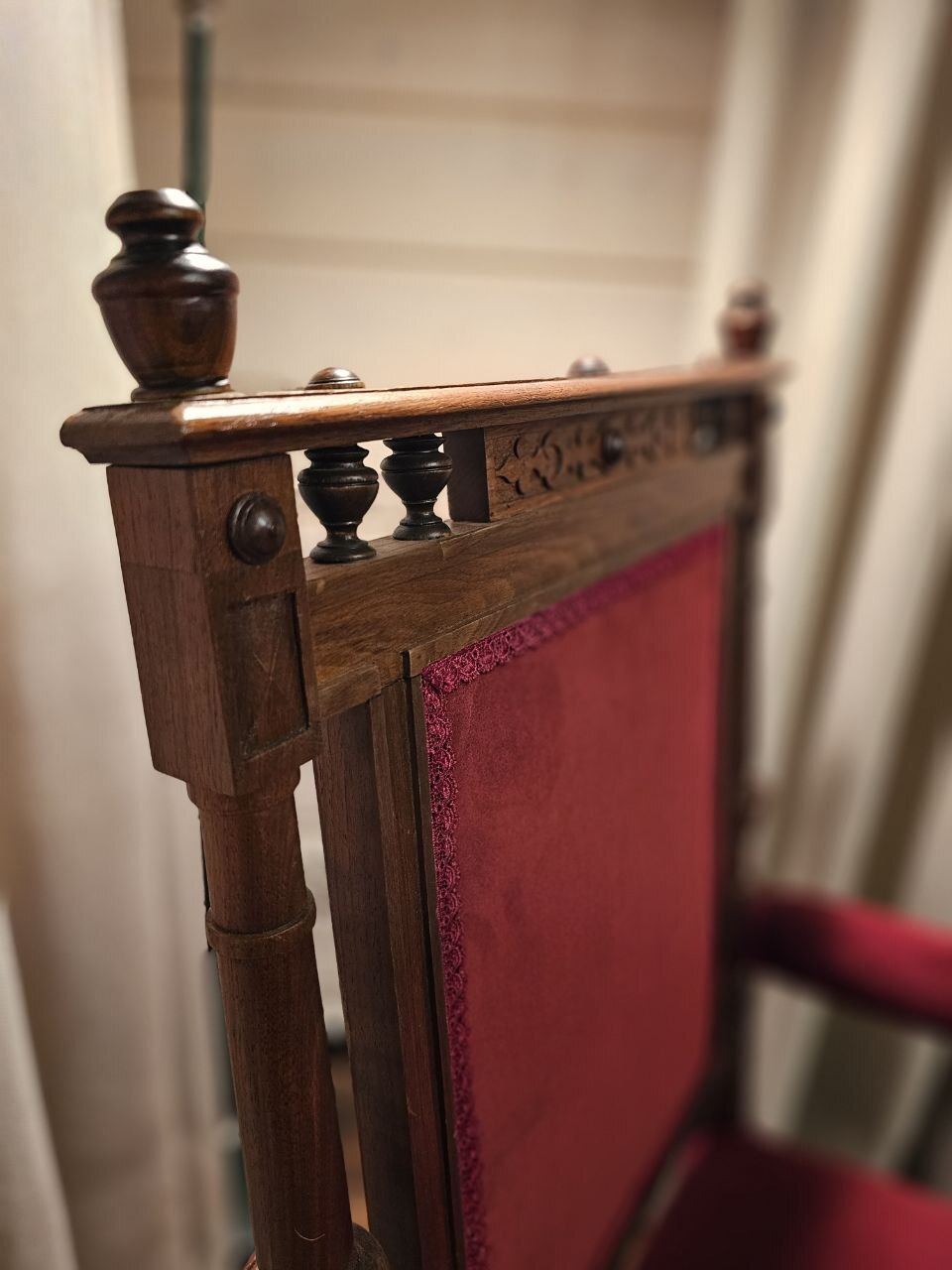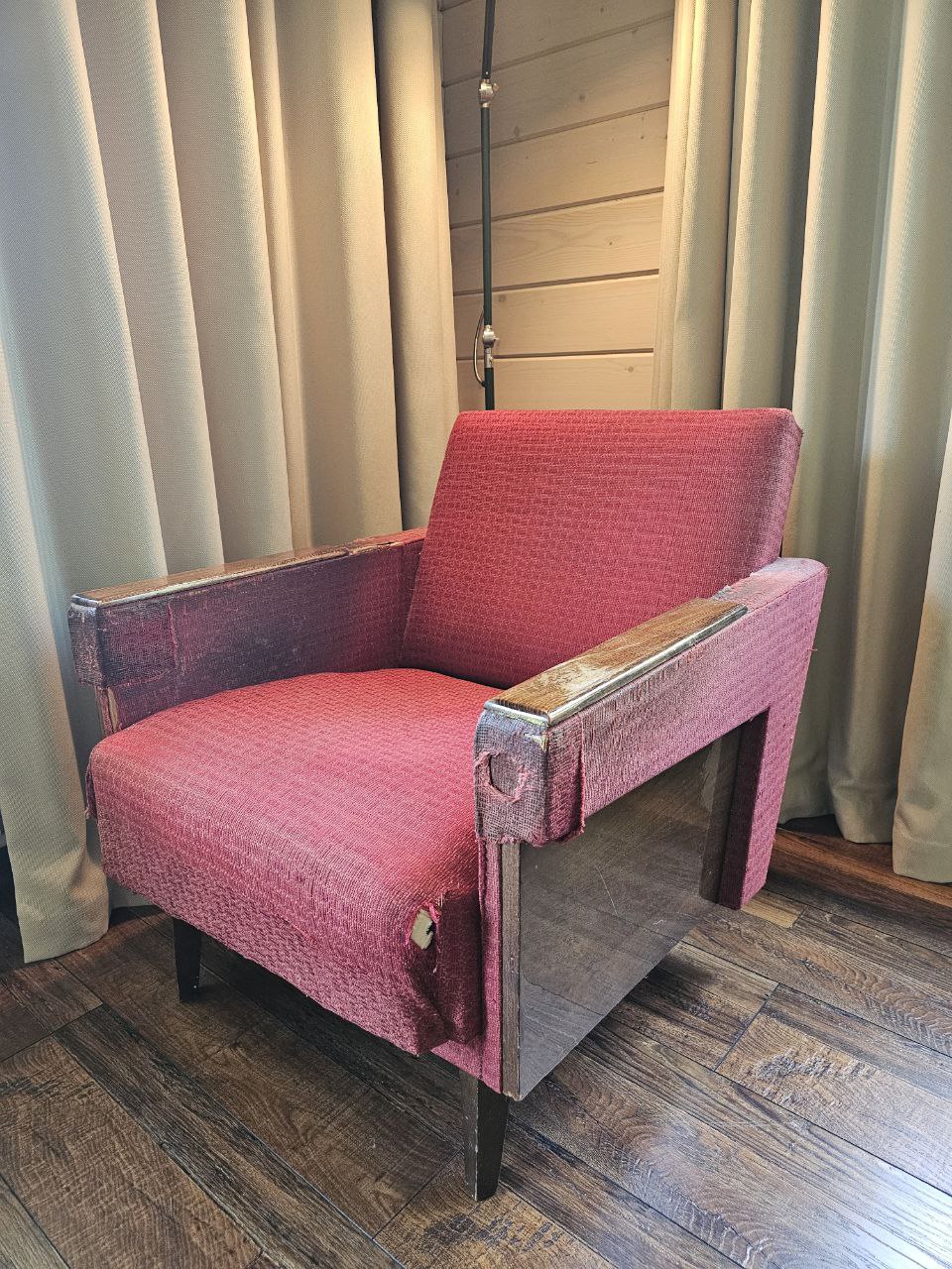 Антикварное кресло 19 век, после аккуратной реставрации. Реставрация по аутентичной технологии, антикварные пружины, водоросли, обивка европейской тканью – красный бархат. Передние ножки на колесиках. При реставрации обнаружены старинные отметки, автограф автора.