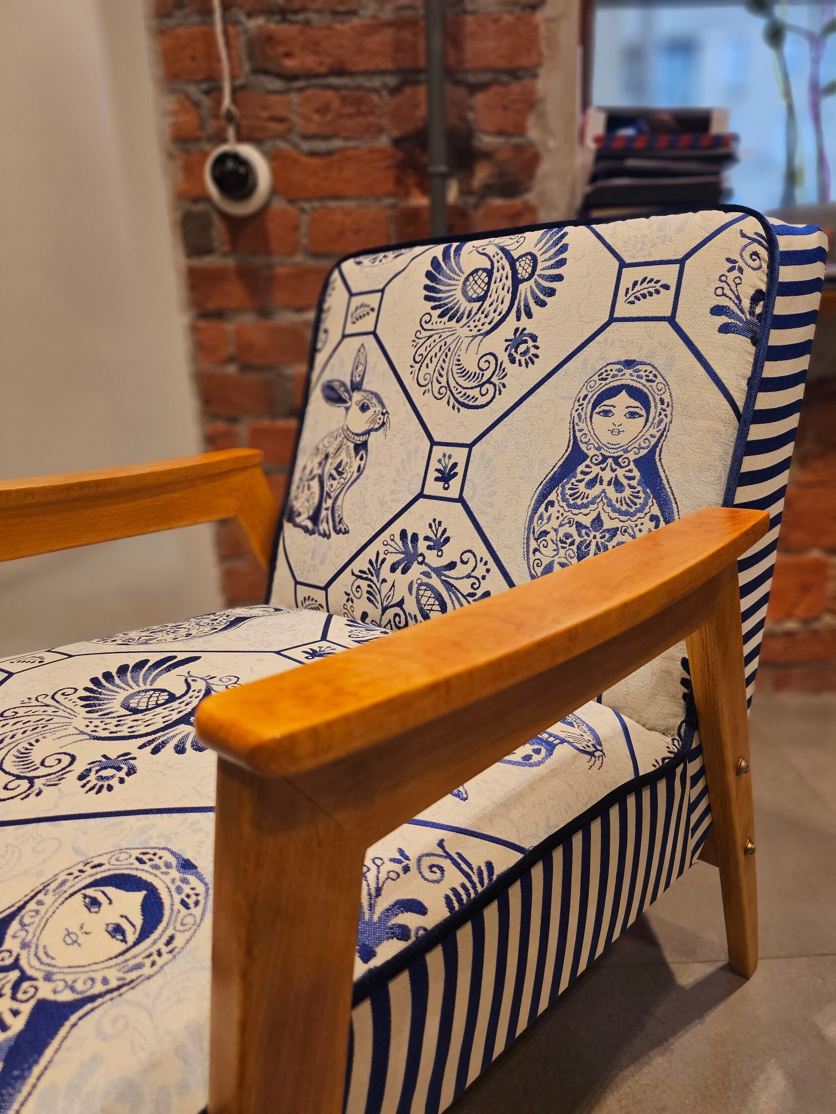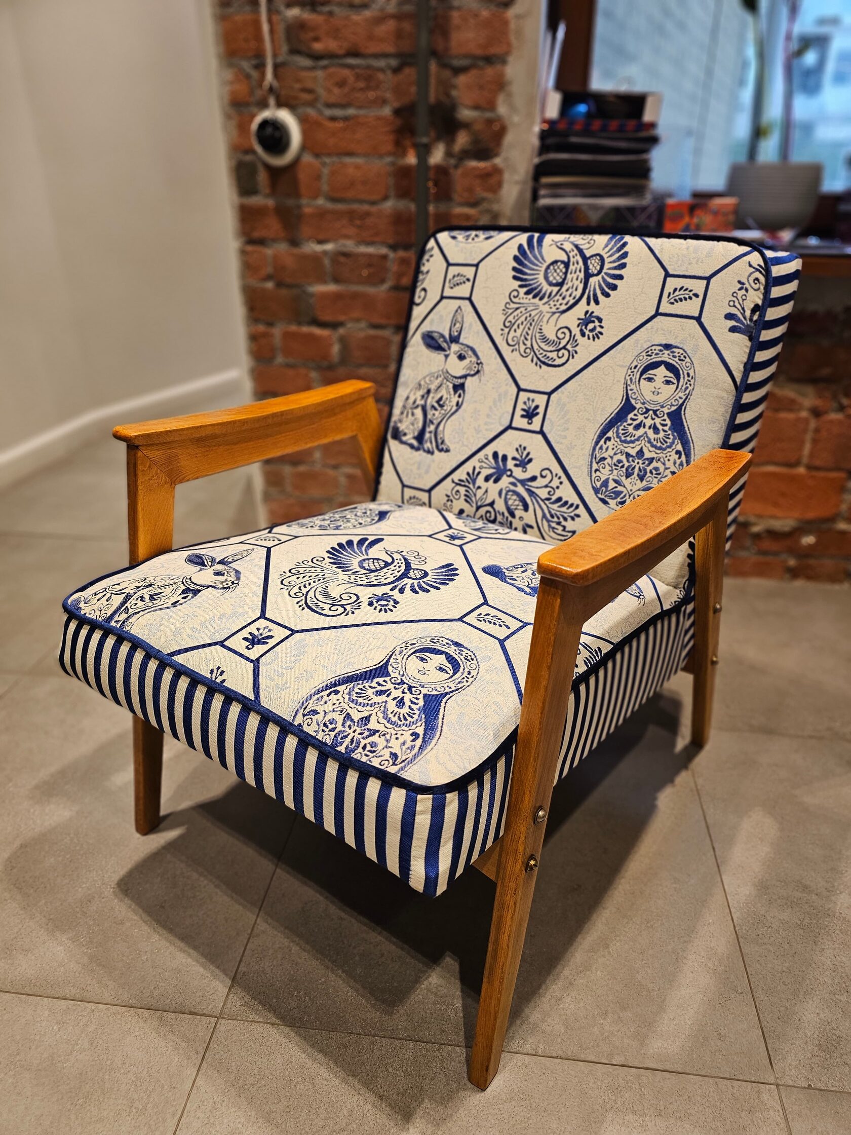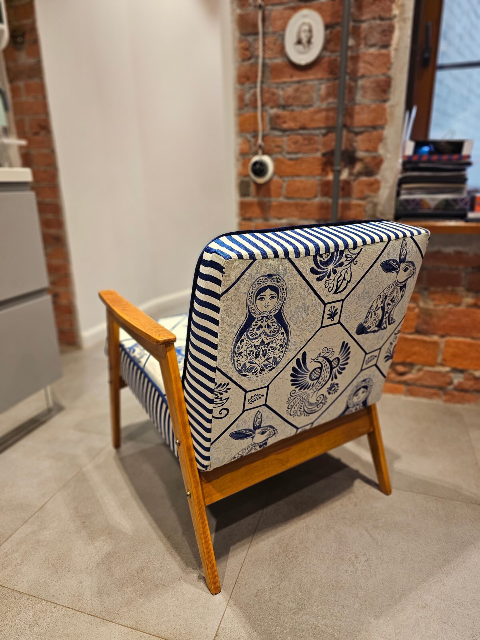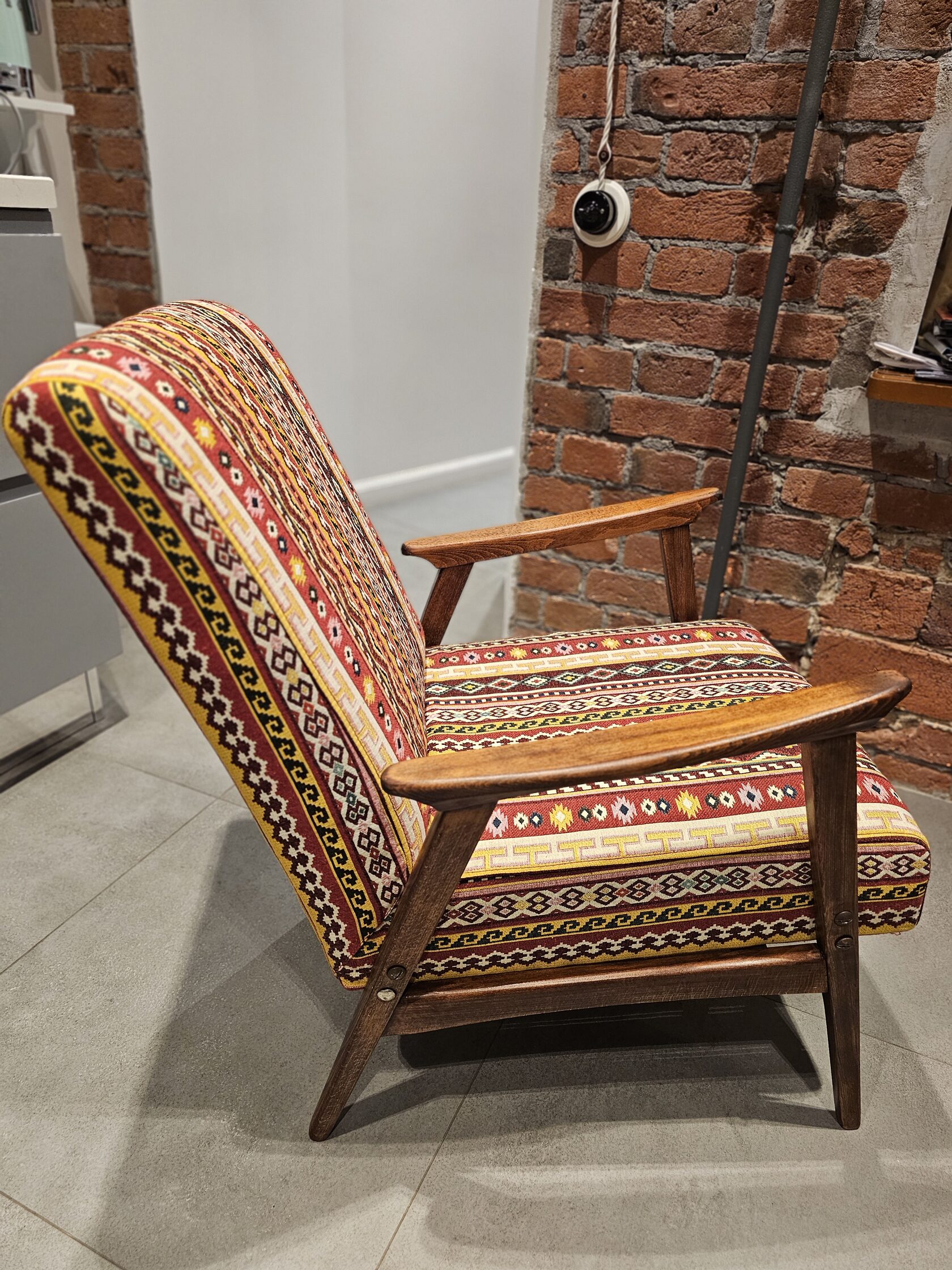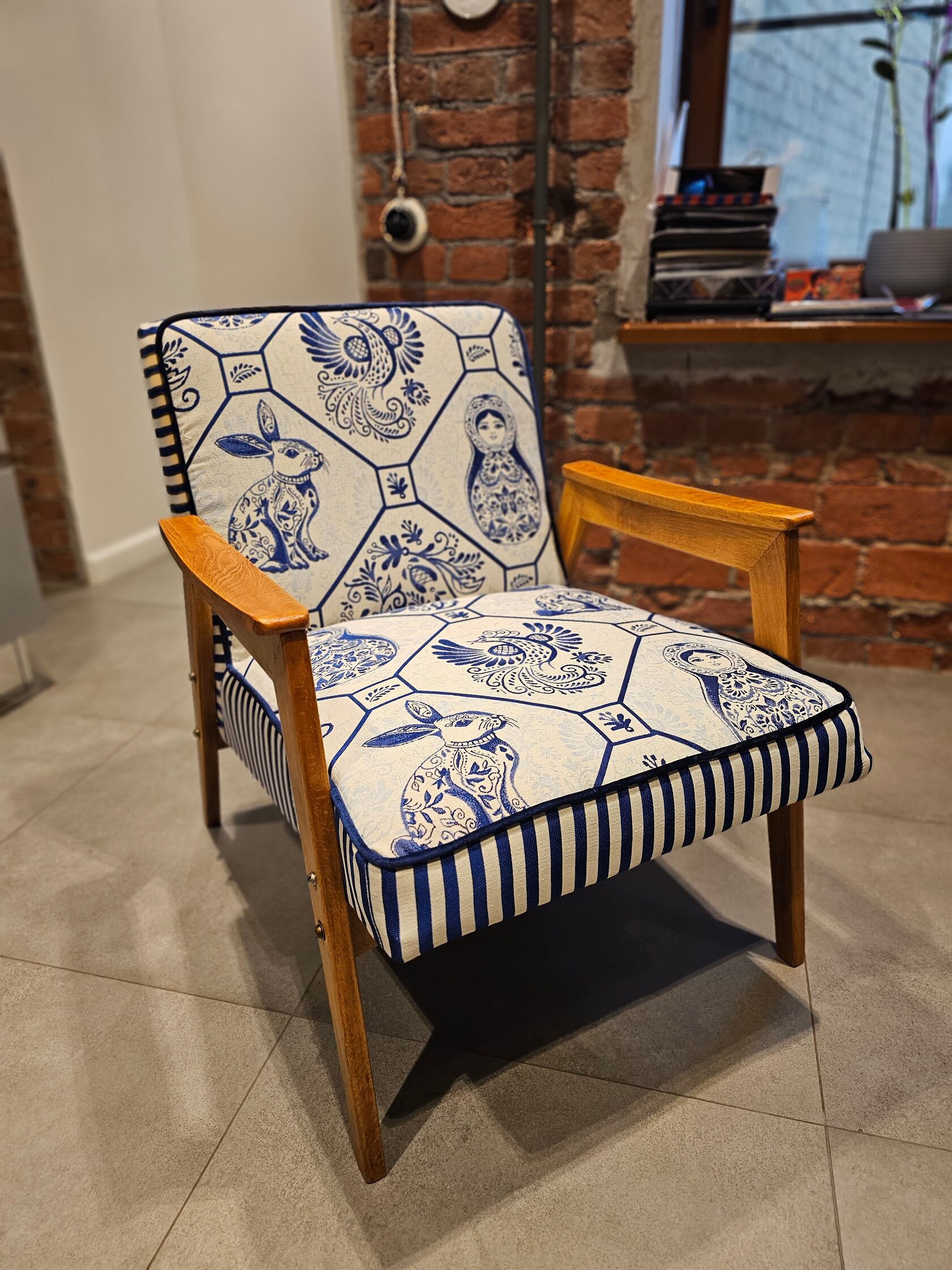Винтажное кресло, 60-е В стиле Пoльского кресла Bunny - дизайнера Jоzеf Сhierоwski. Полная реставрация. Ткань, гобелен - рисунок хохлома, в сочетании двух видов, черного и белого. В наличии 2 шт. , цена указана за 1 кресло