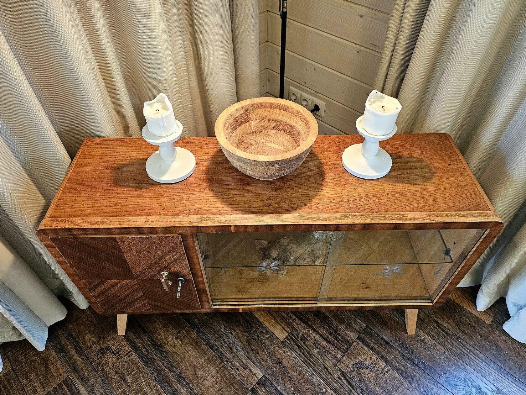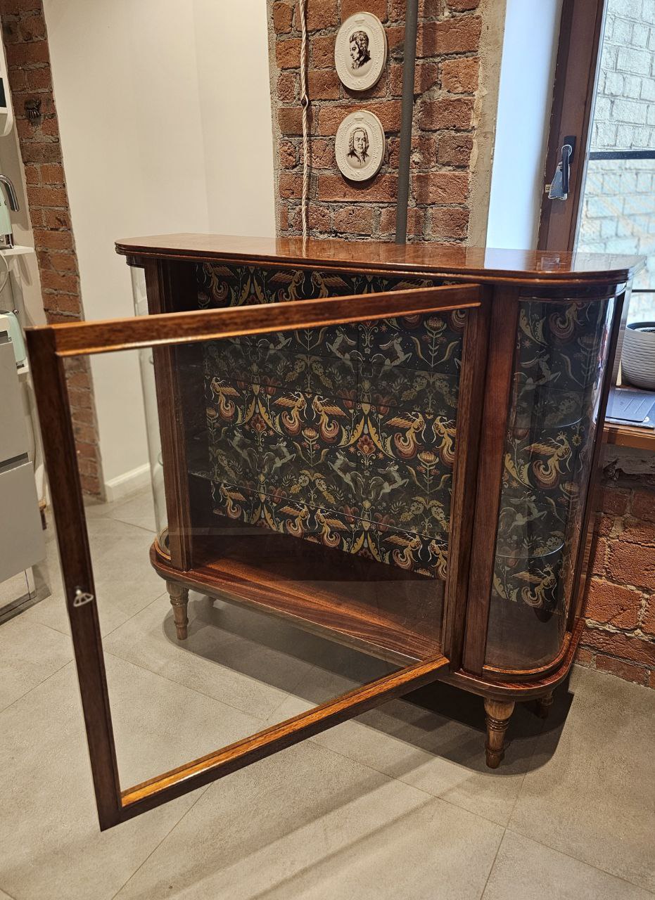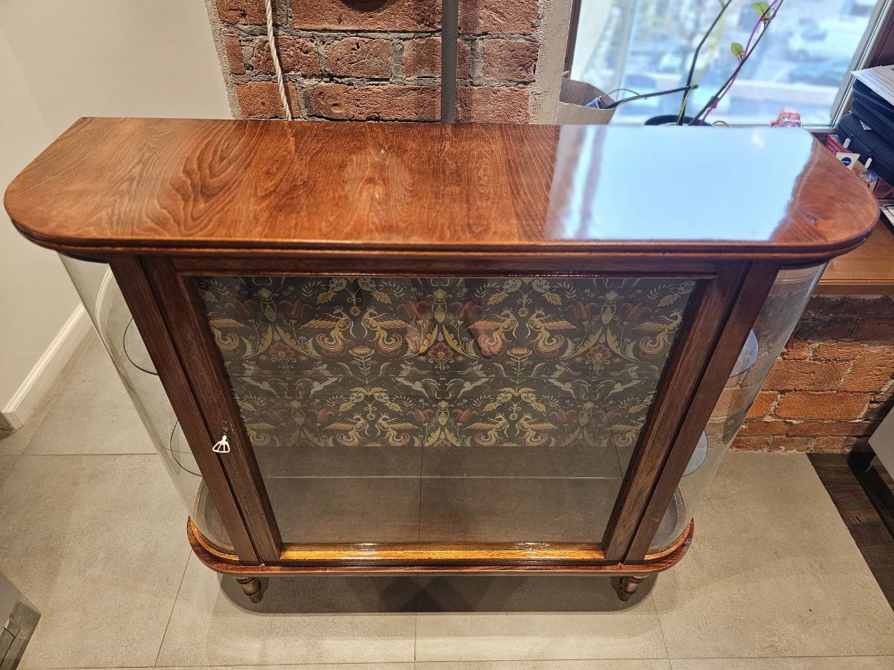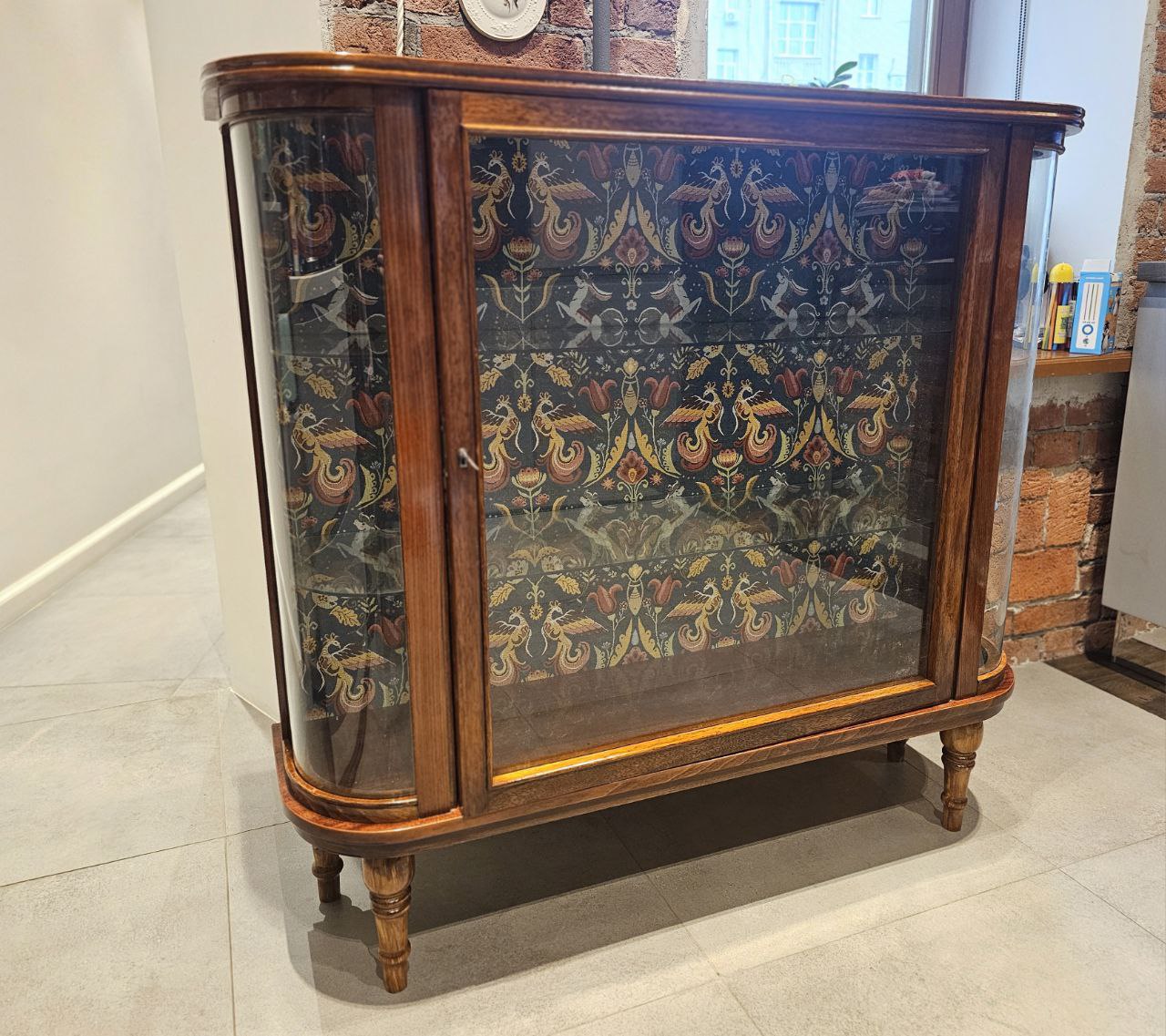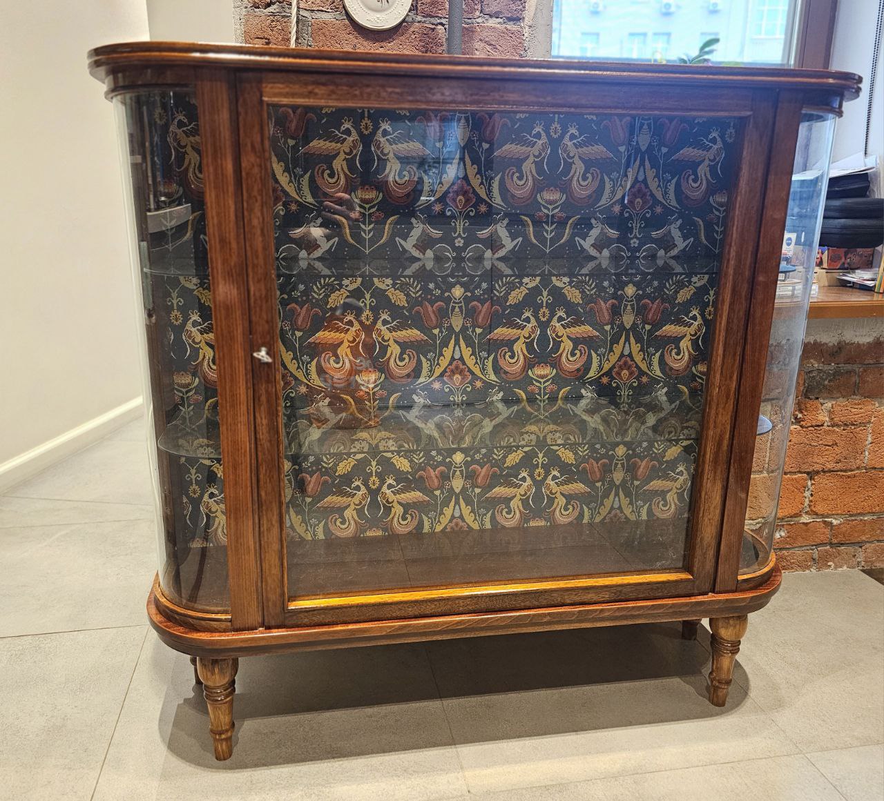 Редизайн, витрина СССР. Верхняя часть советского буфета 50-х годов, поставлена на ножки. Массив, шпон. Отреставрировано покрытие, оригинальные стекла, фасадная часть – шпон красного дерева. Одна из особенностей: дверца витрины покрыта шпоном с разным направлением волокон, как шахматная доска. Под разным углом обзора шпон получается разного цвета, это придает невероятный «ВАУ» эффект.