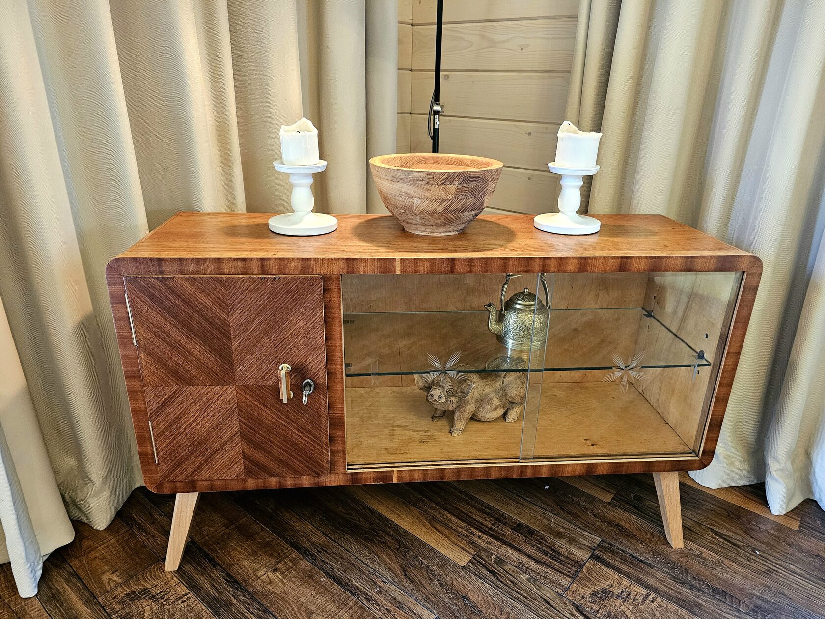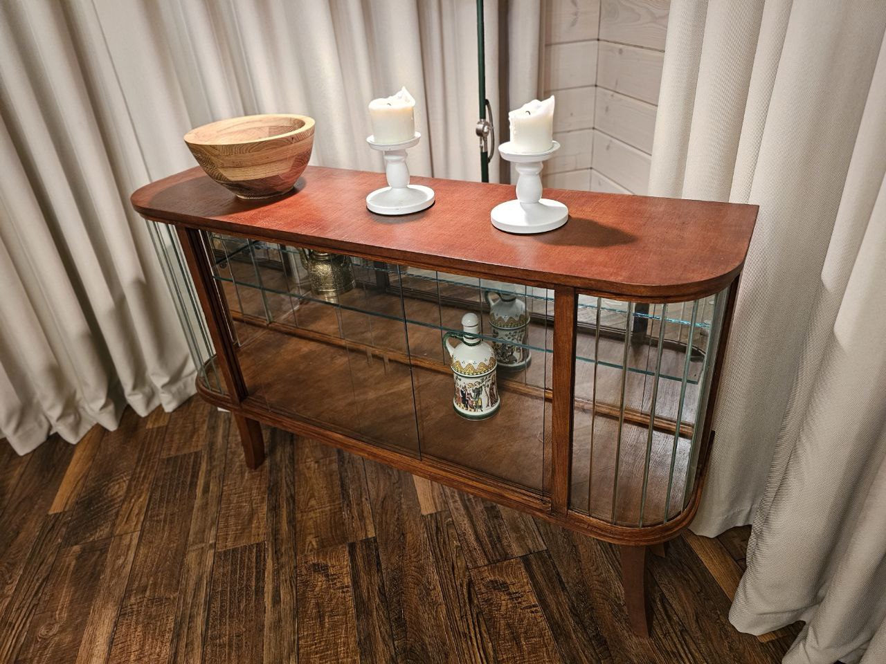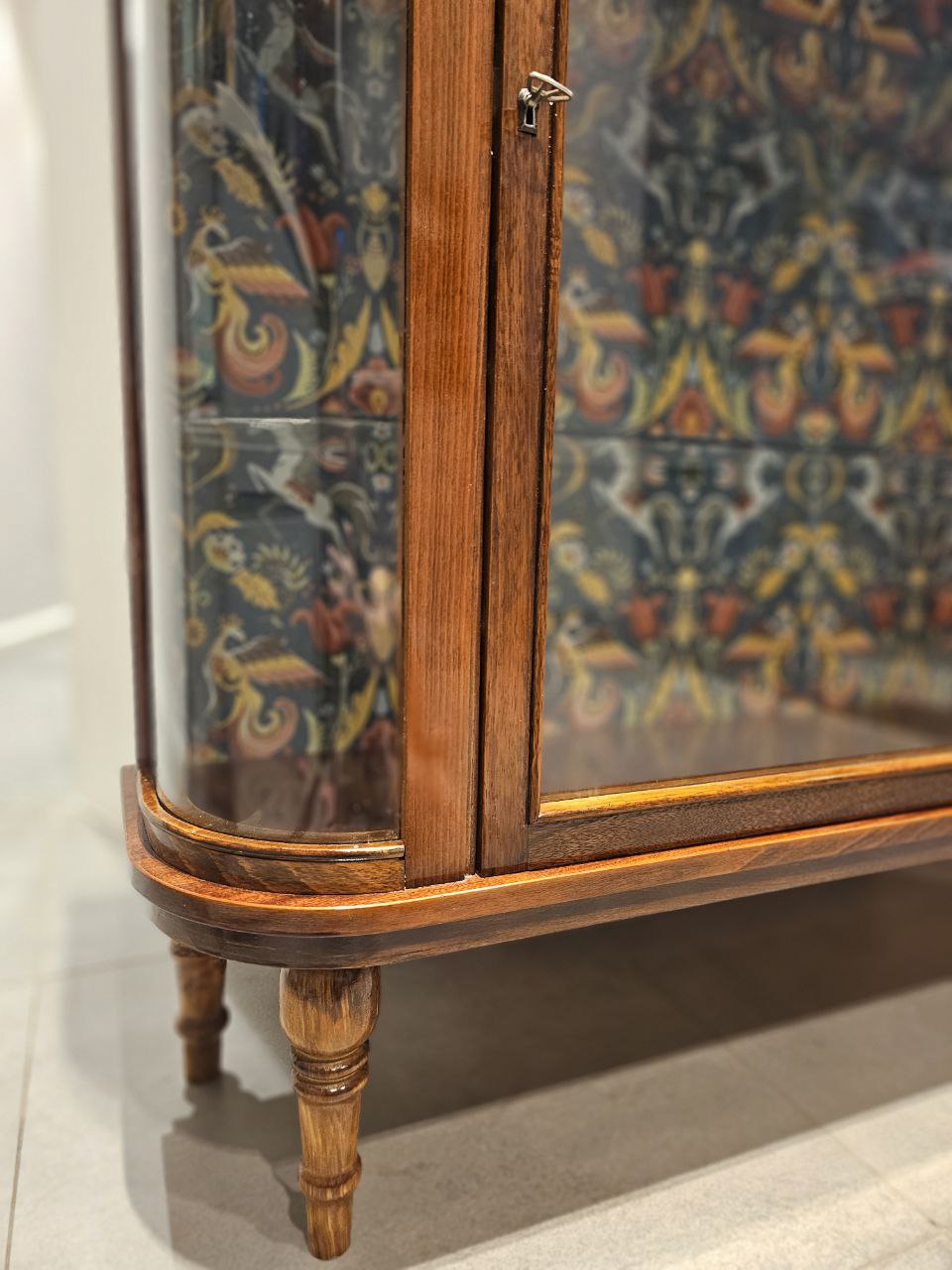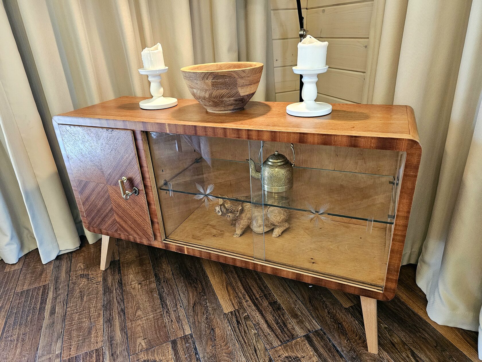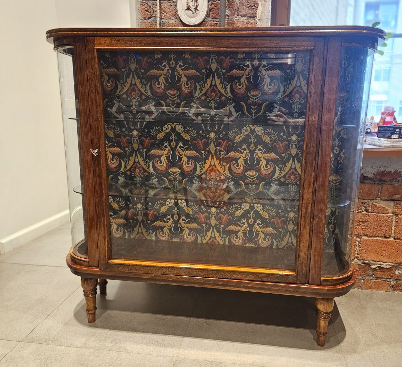 Редизайн, витрина СССР. Верхняя часть советского буфета 50-х годов, поставлена на ножки. Массив, шпон. Отреставрировано покрытие, оригинальные стекла, фасадная часть – шпон красного дерева. Одна из особенностей: дверца витрины покрыта шпоном с разным направлением волокон, как шахматная доска. Под разным углом обзора шпон получается разного цвета, это придает невероятный «ВАУ» эффект.