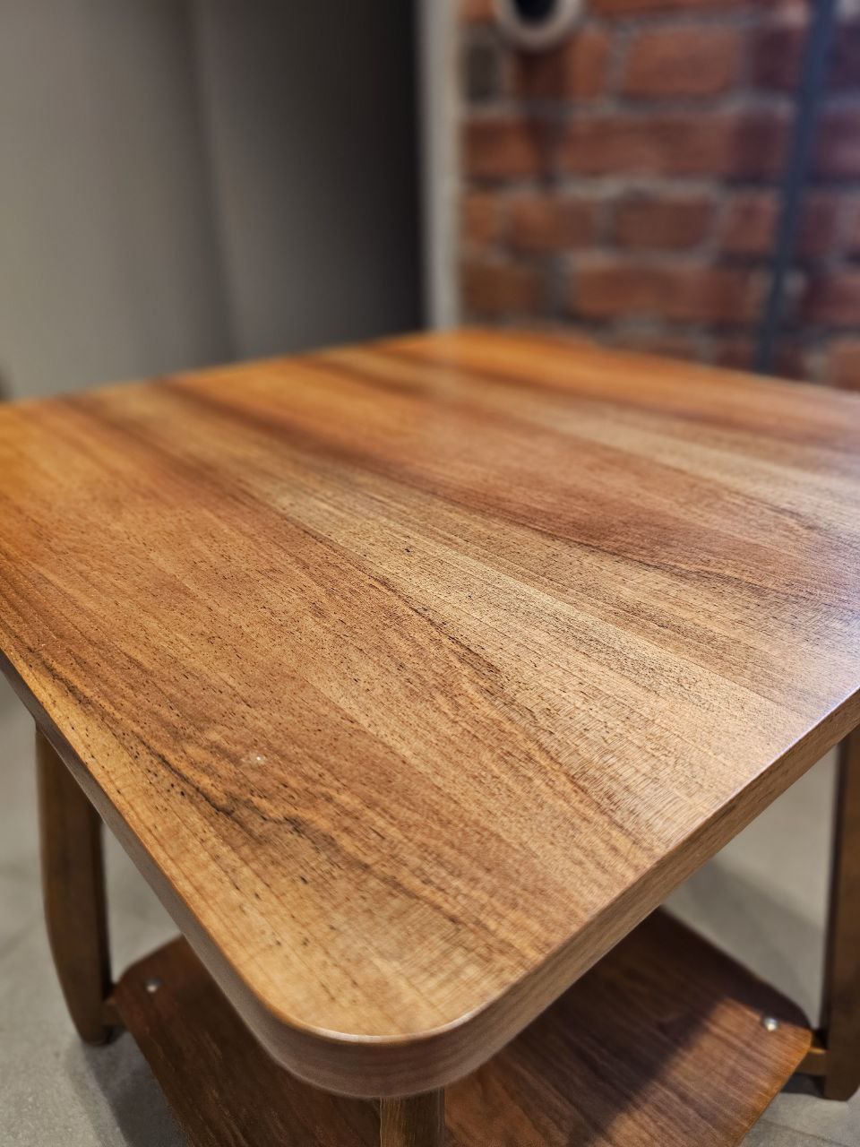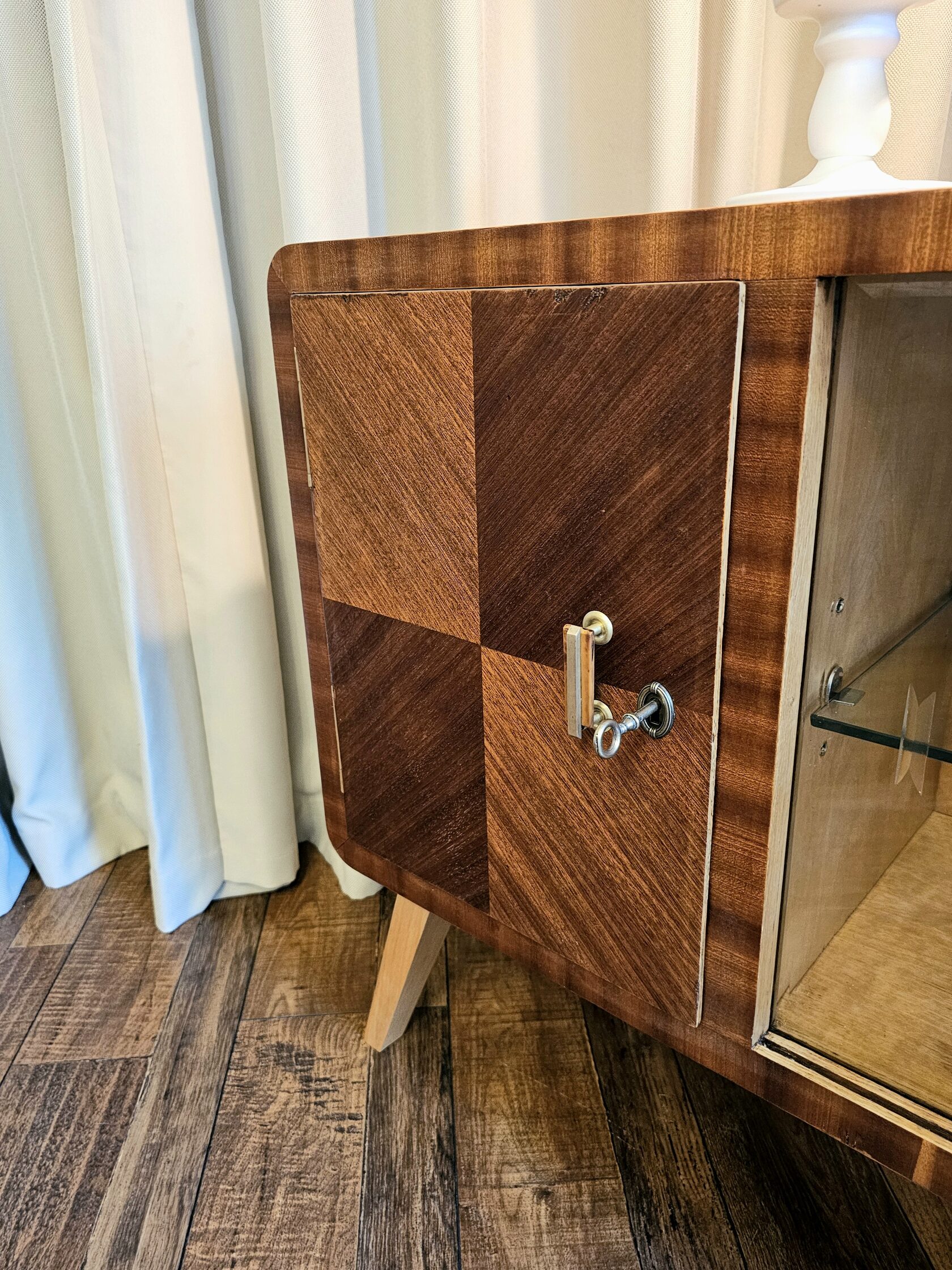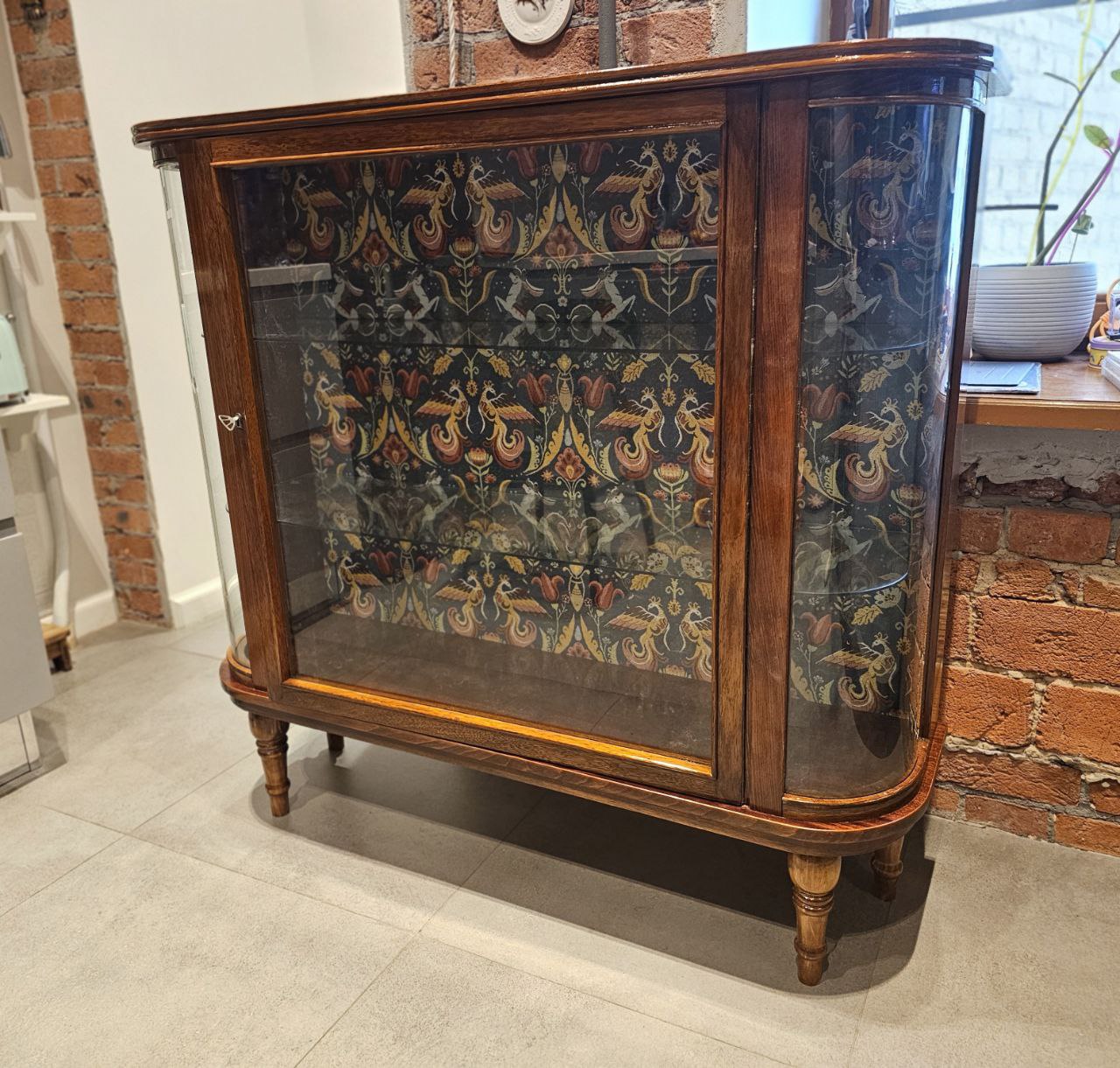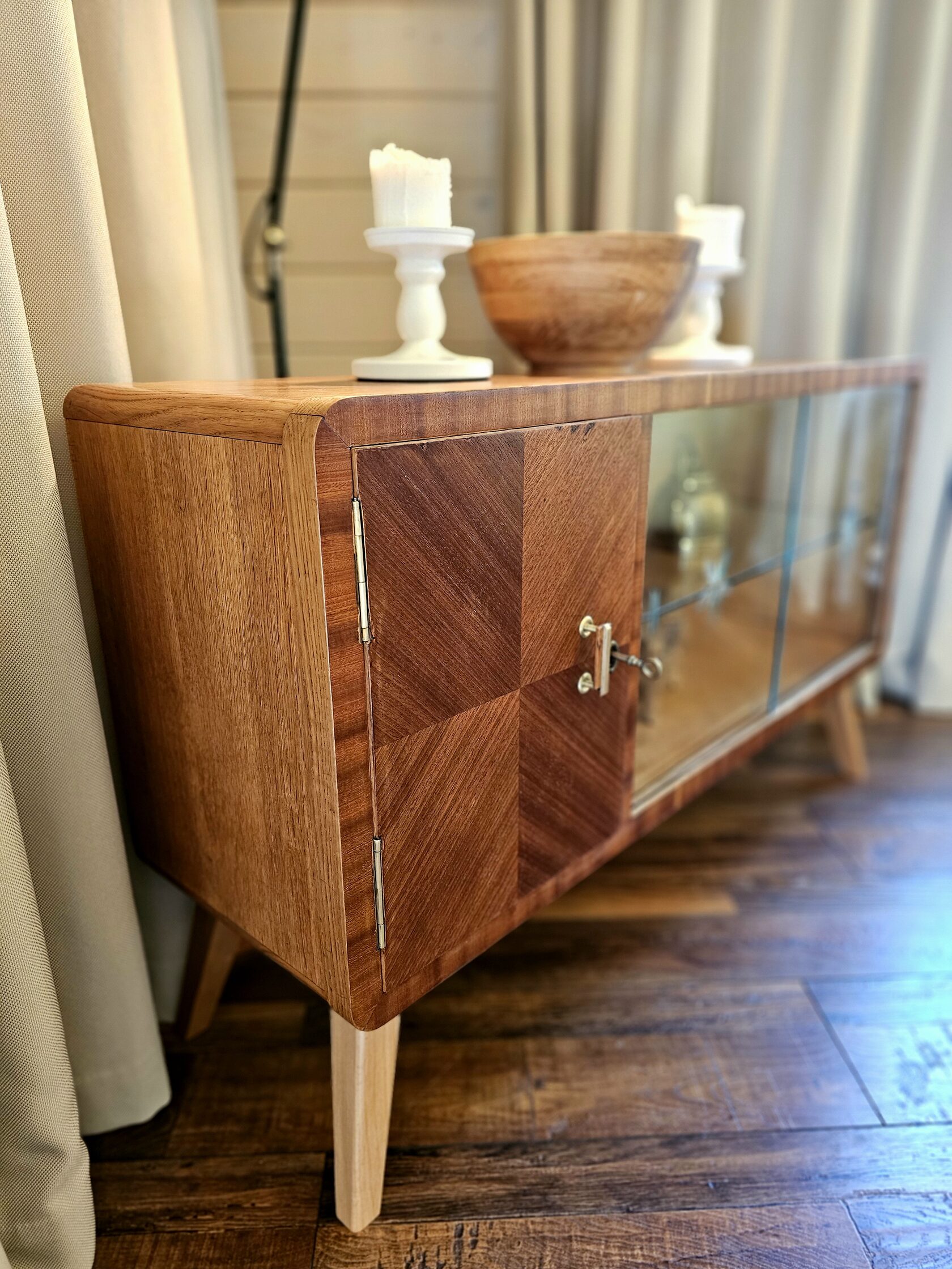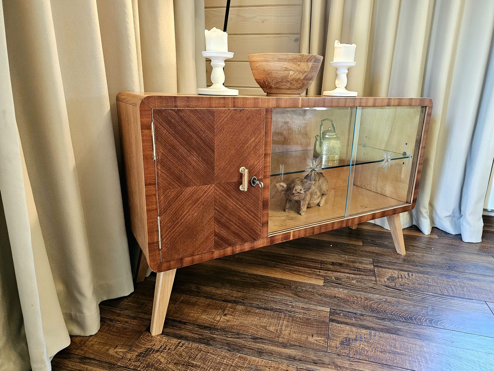 Редизайн, витрина СССР. Верхняя часть советского буфета 50-х годов, поставлена на ножки. Массив, шпон. Отреставрировано покрытие, оригинальные стекла, фасадная часть – шпон красного дерева. Одна из особенностей: дверца витрины покрыта шпоном с разным направлением волокон, как шахматная доска. Под разным углом обзора шпон получается разного цвета, это придает невероятный «ВАУ» эффект.