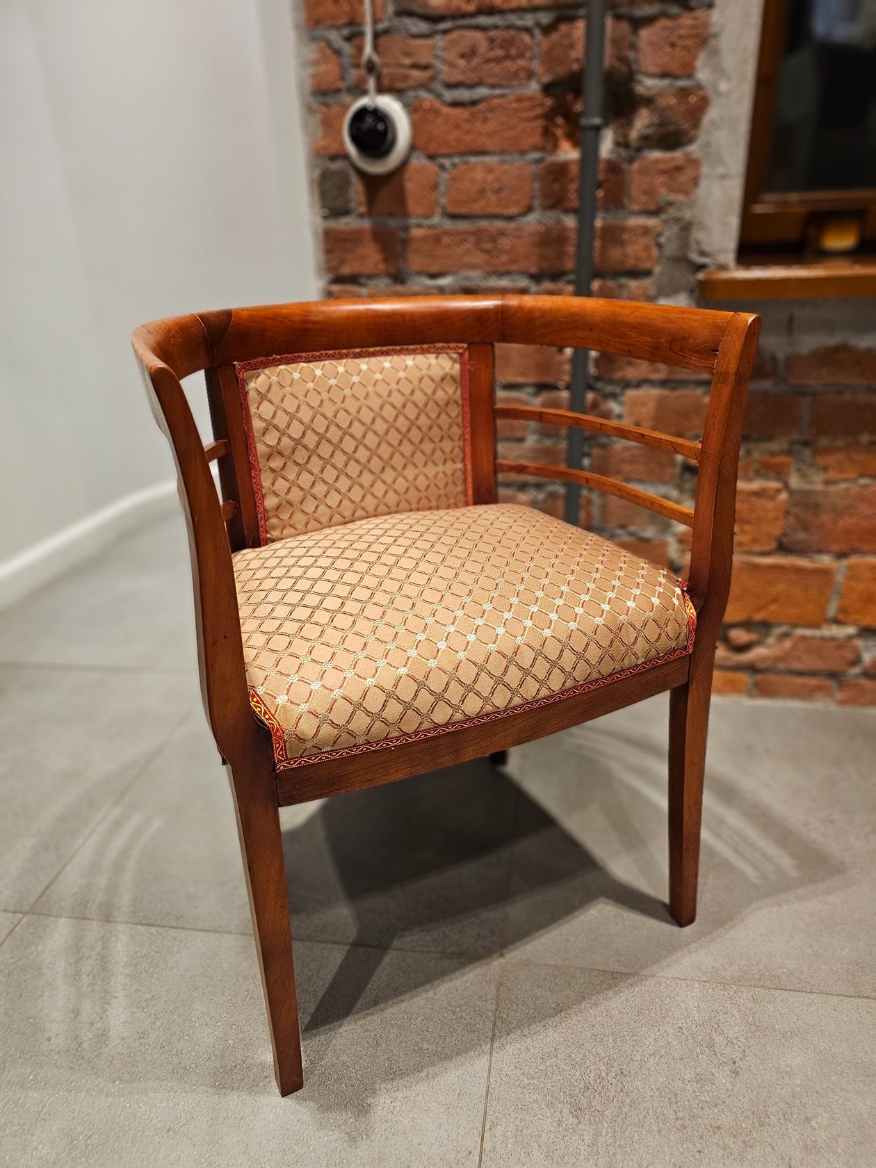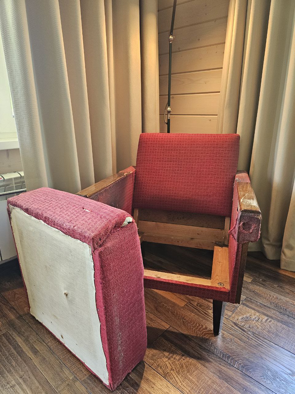 Винтажные кресла, для номера люкс из Гостиницы Россия (в 2006 года гостиница «Россия» была закрыта, а к 2010 году снесена), производство Италия, в стиле Бидермайер. Набивка водоросли, крепкие, дерево без трещин, требуют обновления покрытия и перетяжки. 3 предмета: Кресло - 2 шт. Журнальный столик – 1шт.
