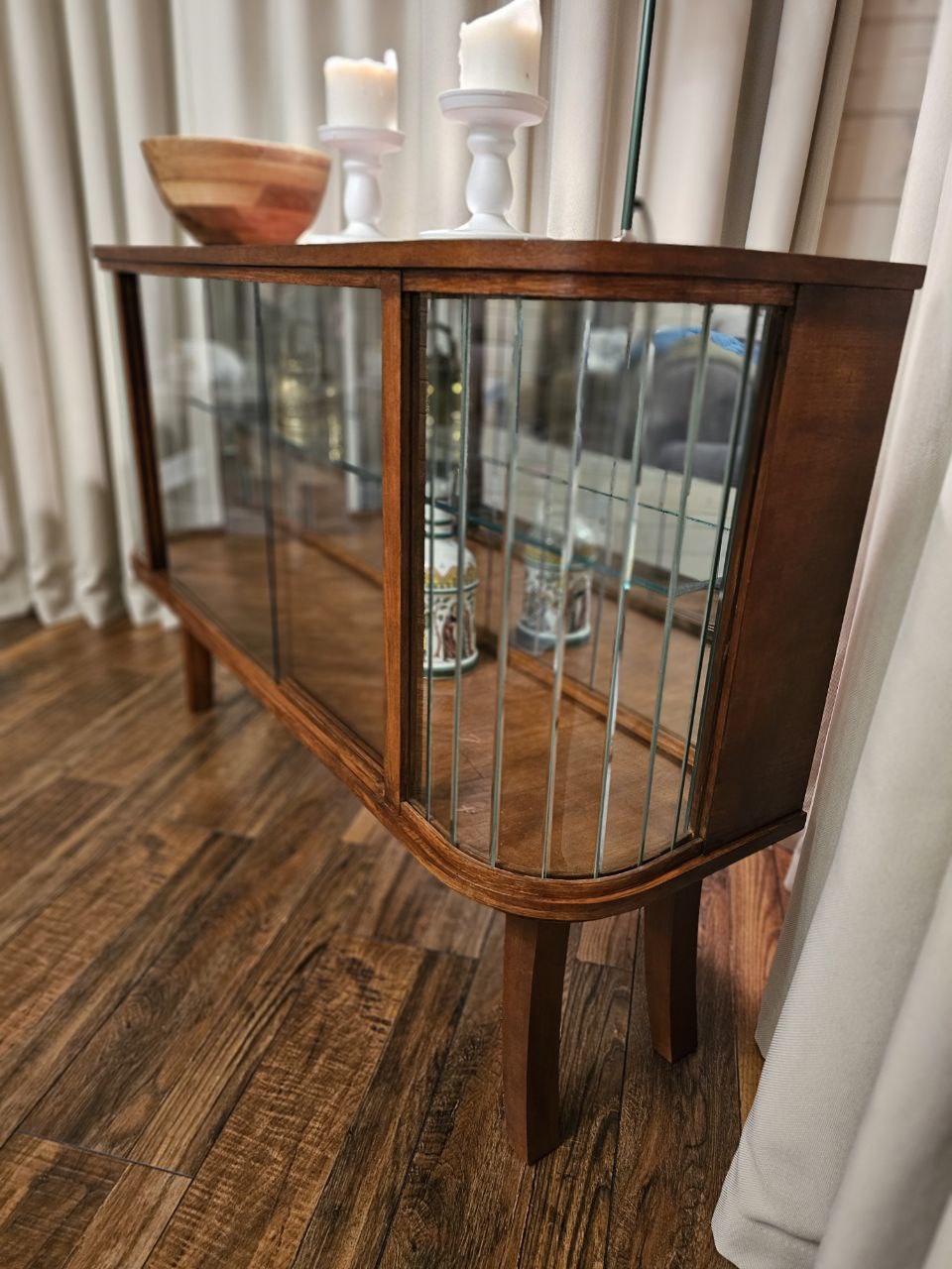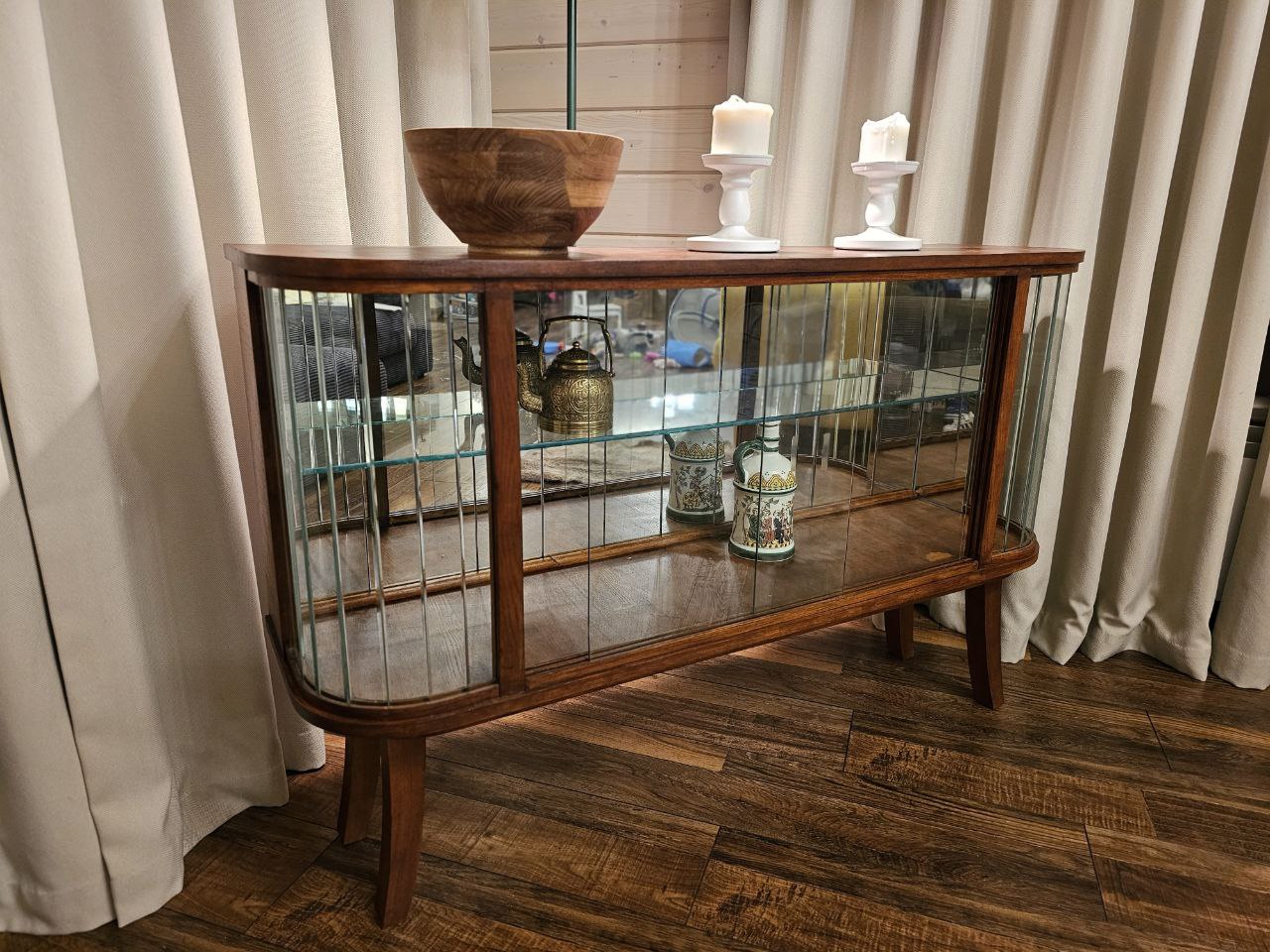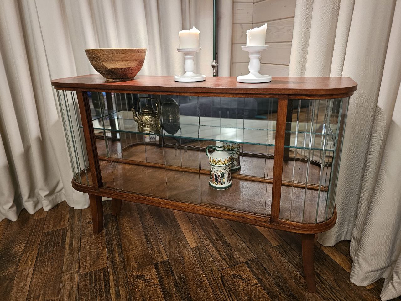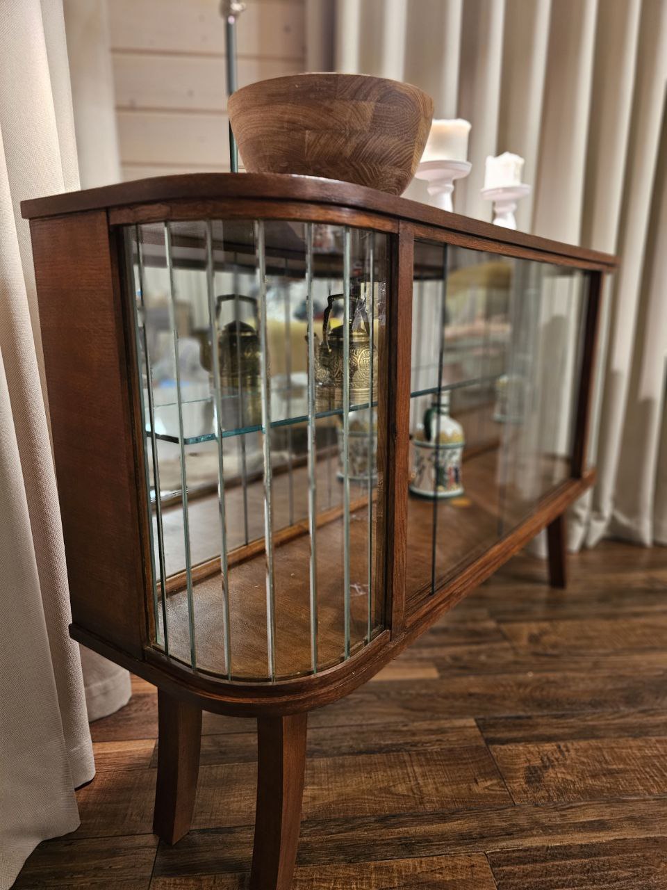 Редизайн, витрина 1949 г. СССР. Верхняя часть советского буфета, поставлена на ножки. Массив, шпон. Отреставрировано покрытие, оригинальные стекла, внутренняя стенка оригинальные зеркала. Добавит в современный интерьер оригинальности и будет ярким акцентом. Размеры: Ширина 125 см Глубина 35.5 см Высота 82 Высота ножек 30 см
