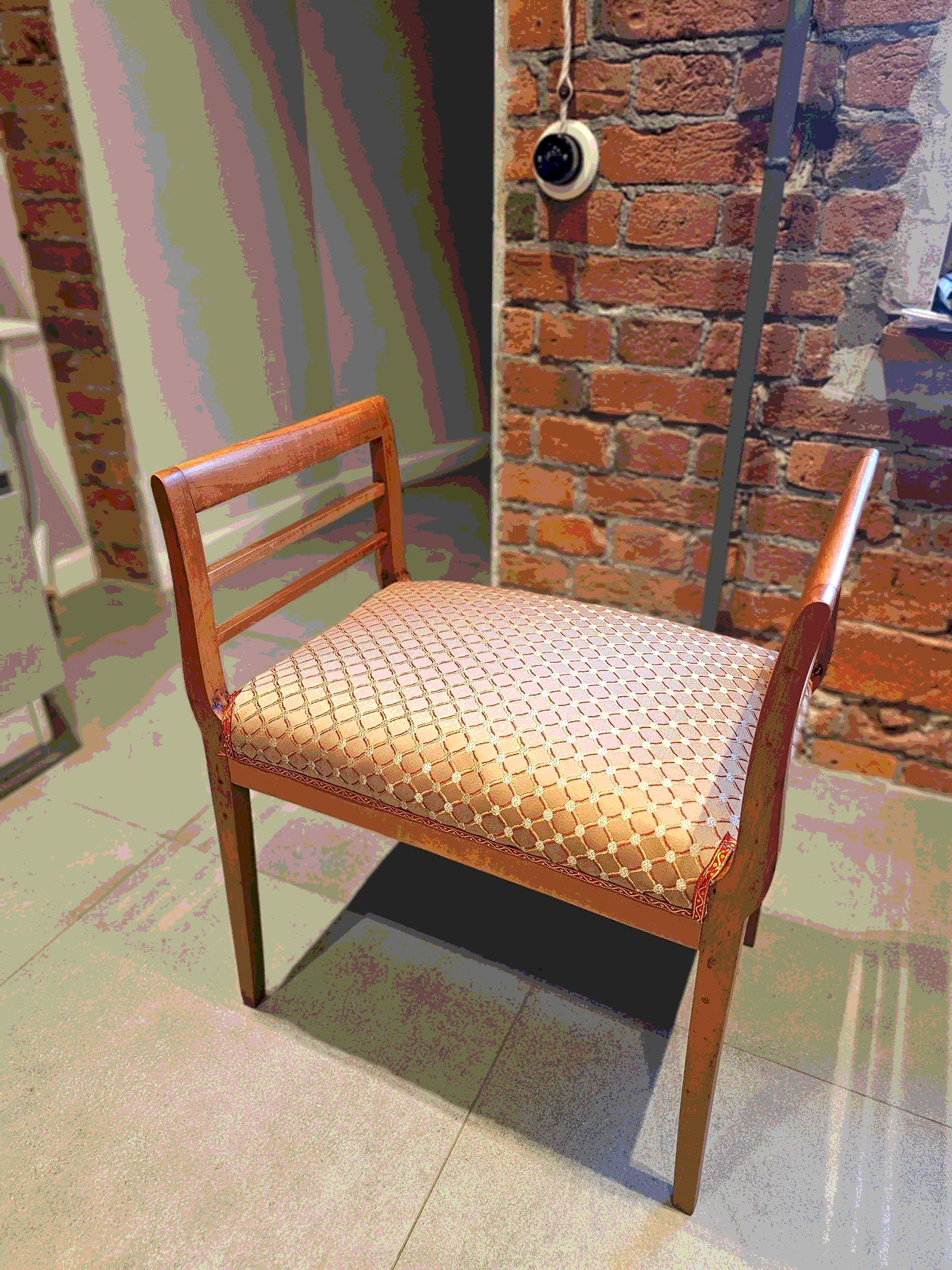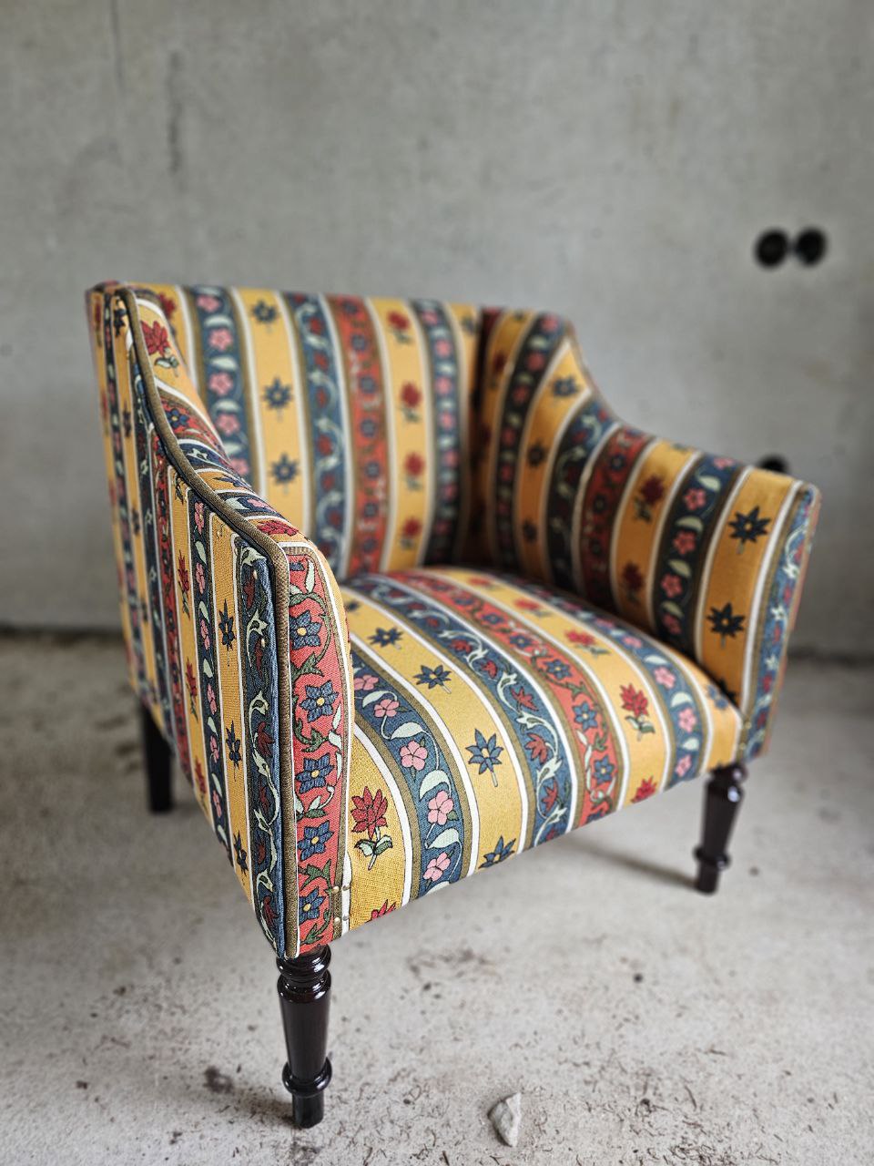 Антикварное кресло, 19 век, из Ярославской губернии, после реставрации. Пружины, наполнение водоросли, европейская мебельная ткань. Металлические оригинальные колпачки на передних ножках добавляют оригинальности и отсылки к возрасту кресла. Возможно использование , как яркого интерьерного акцента в доме и квартире. Размеры: Кресло - высота по спинке: 98 Ширина сидения: 60 Высота сидения: 37 Глубина сидения: 52