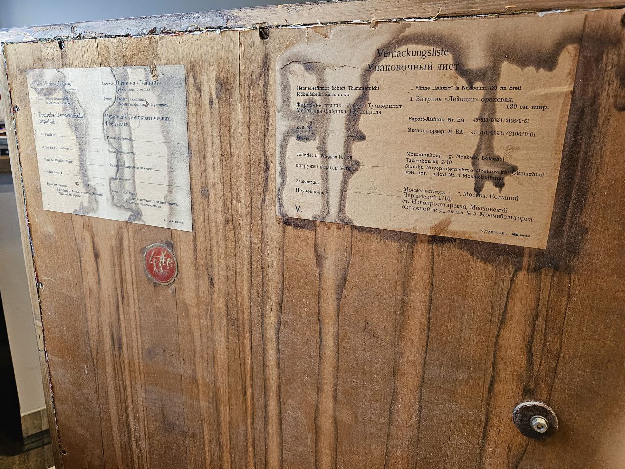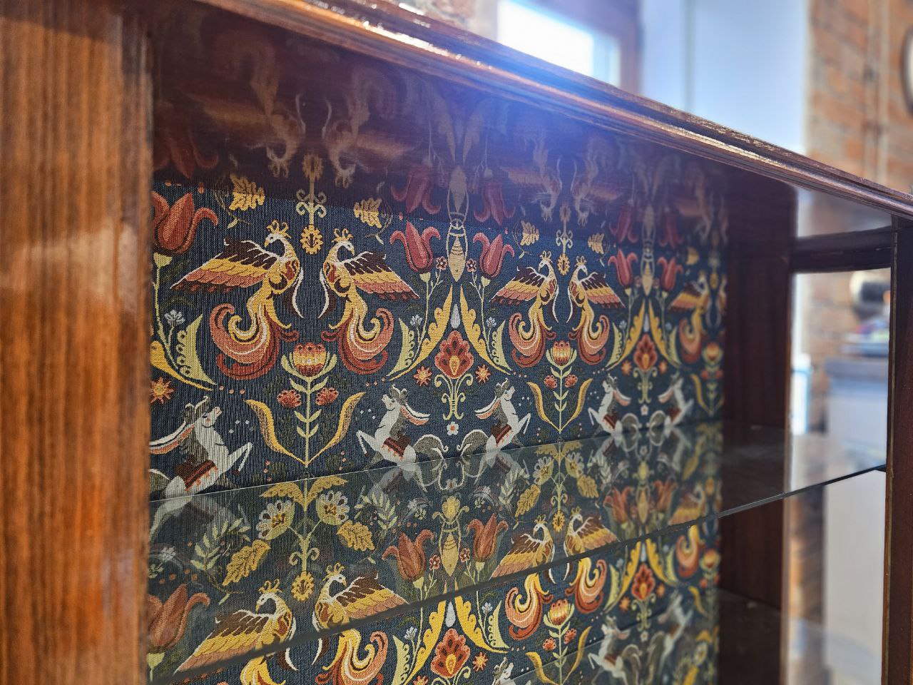 Редизайн, антикварная витрина "Лейпциг", ГДР 1960 е. Верхняя часть буфета Лейпциг поставлена на ножки. Массив, шпон, реставрация лакокрасочного покрытия, стенка - гобелен по мотивам русской сказки Конек Горбунок.