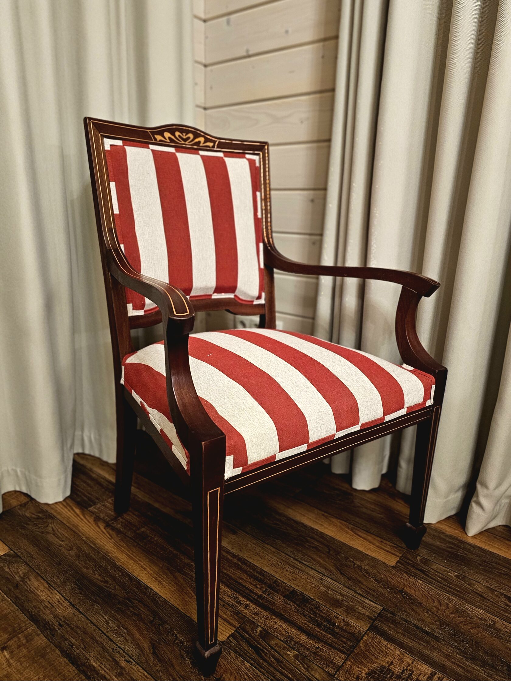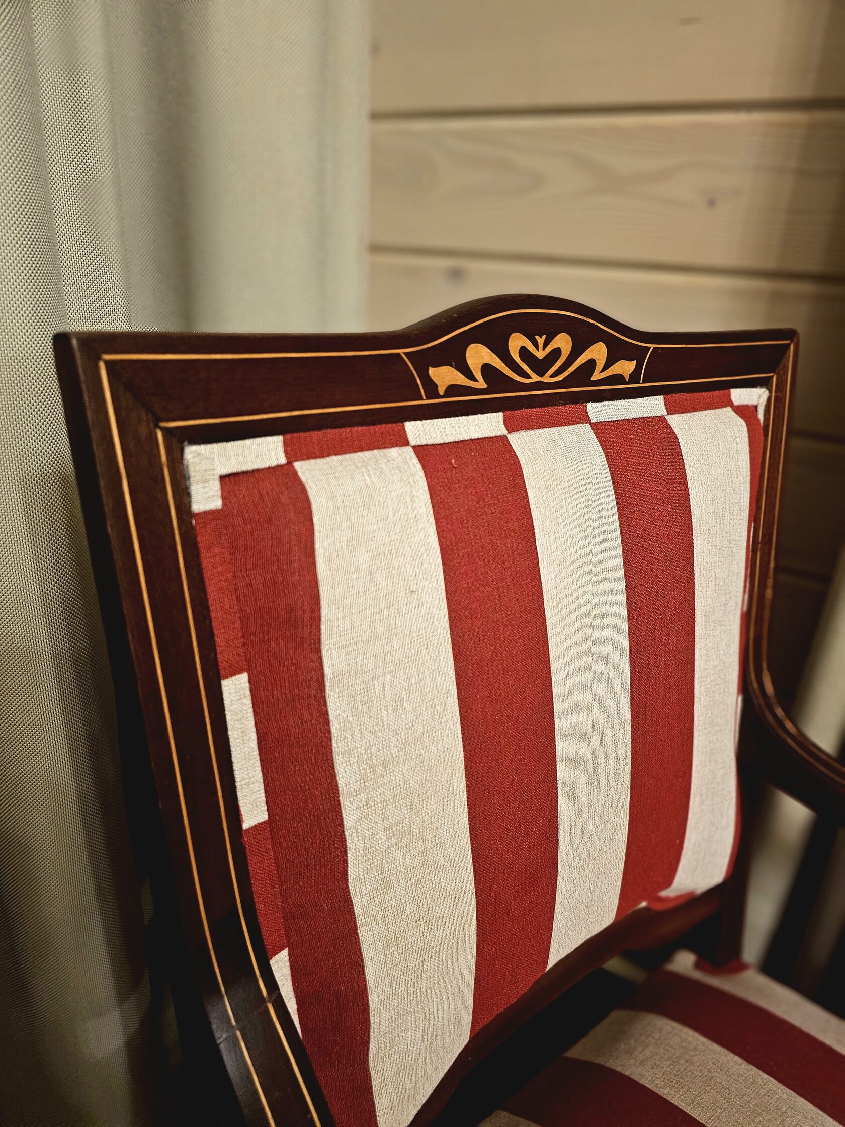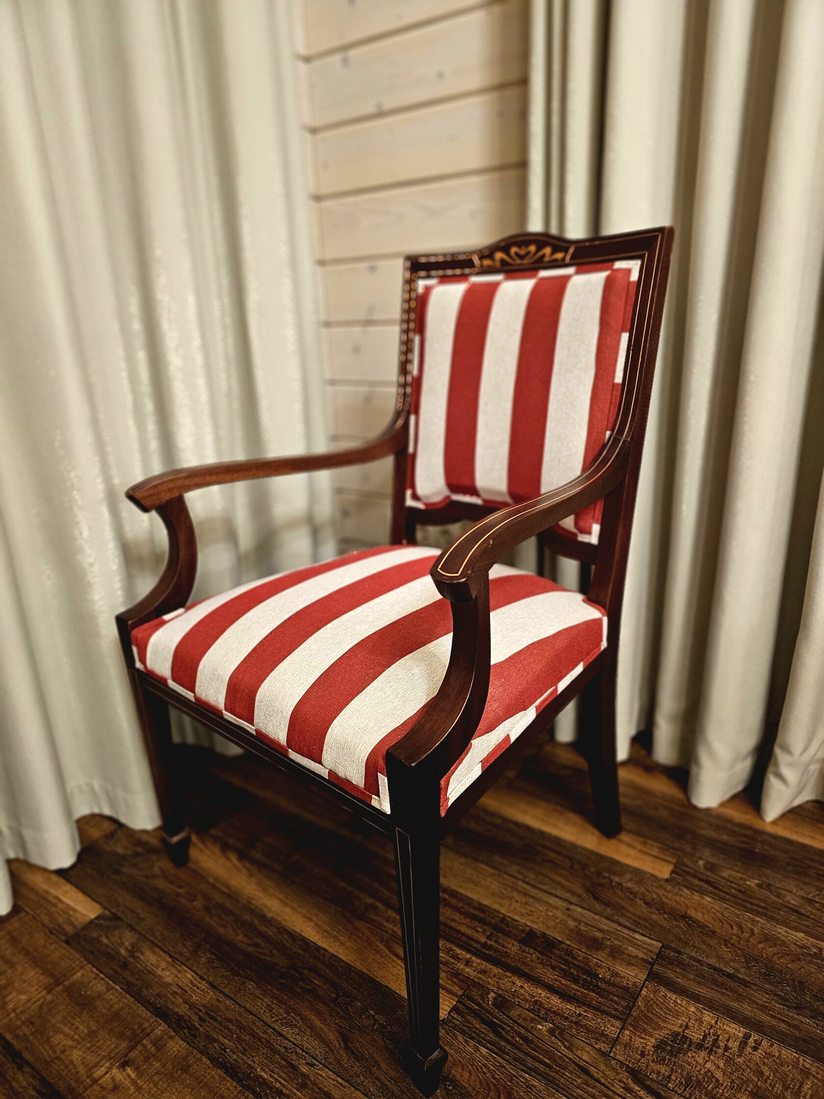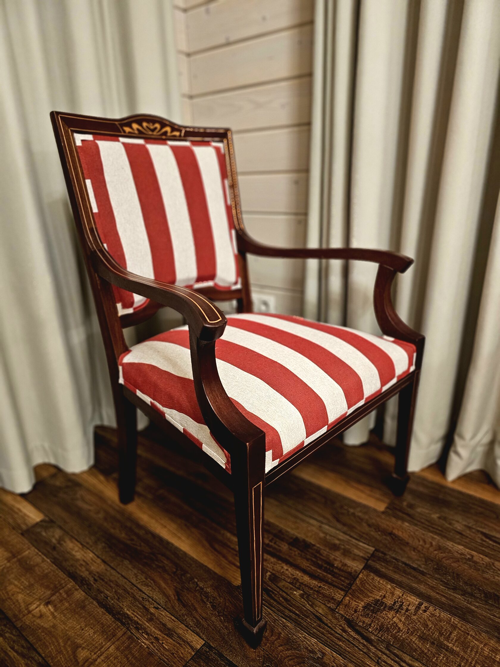 Антикварное, кабинетное кресло, конец 19 века, в стиле модерн. Красное дерево, инкрустация - груша. Проведена бережная реставрация по аутентичным традициям того времени, наполнение водоросли, пружины, ткань - гобелен.