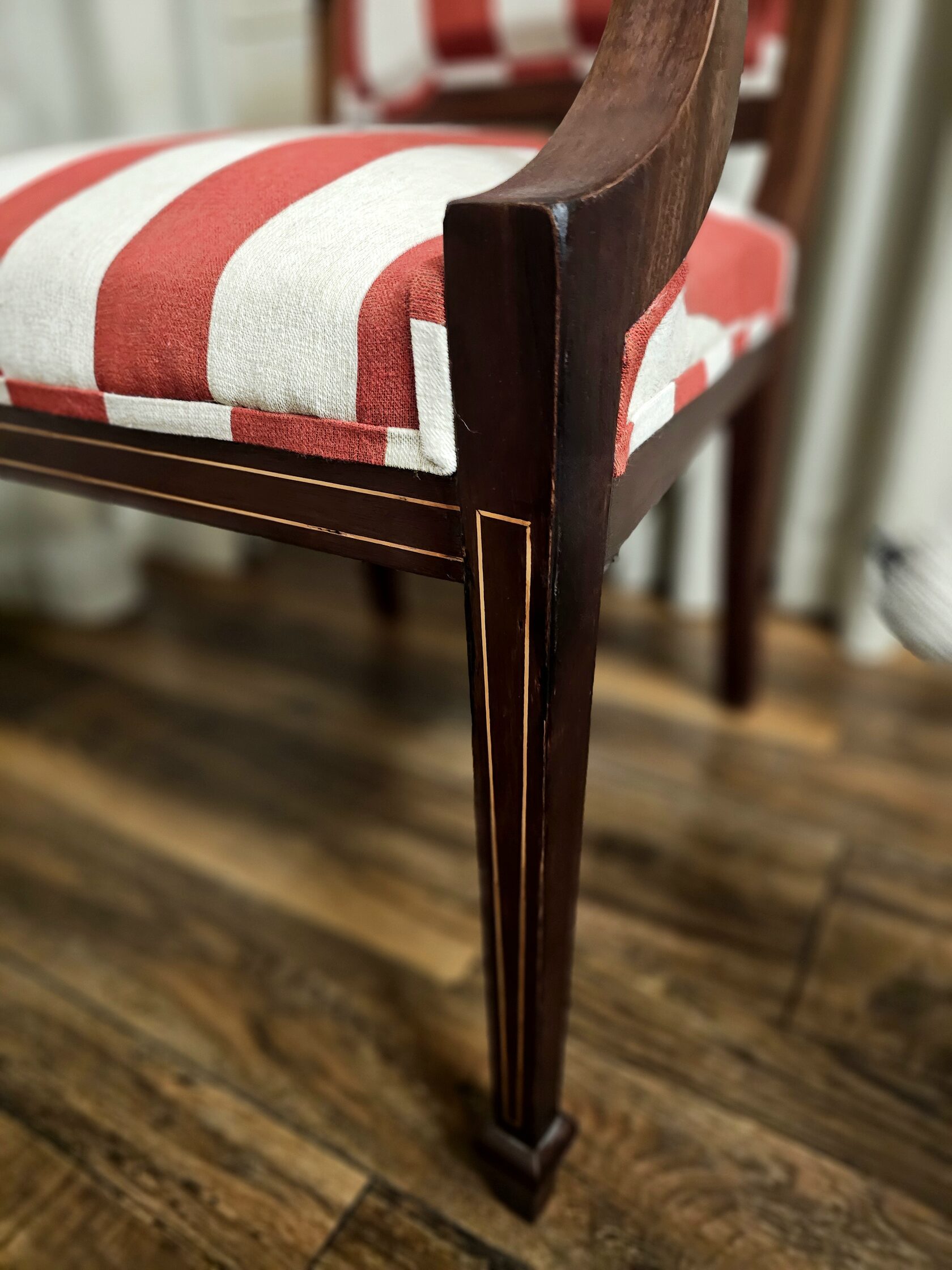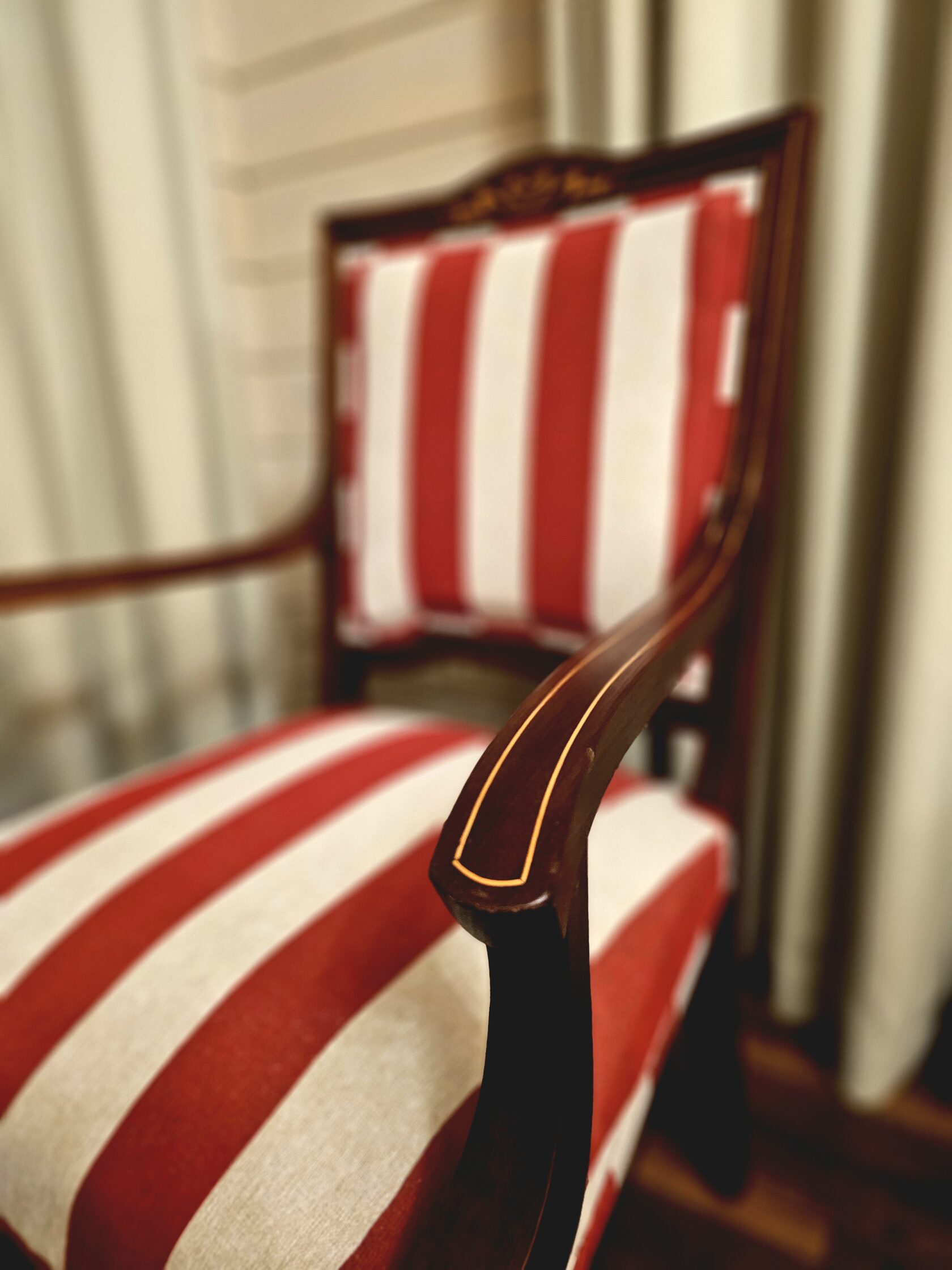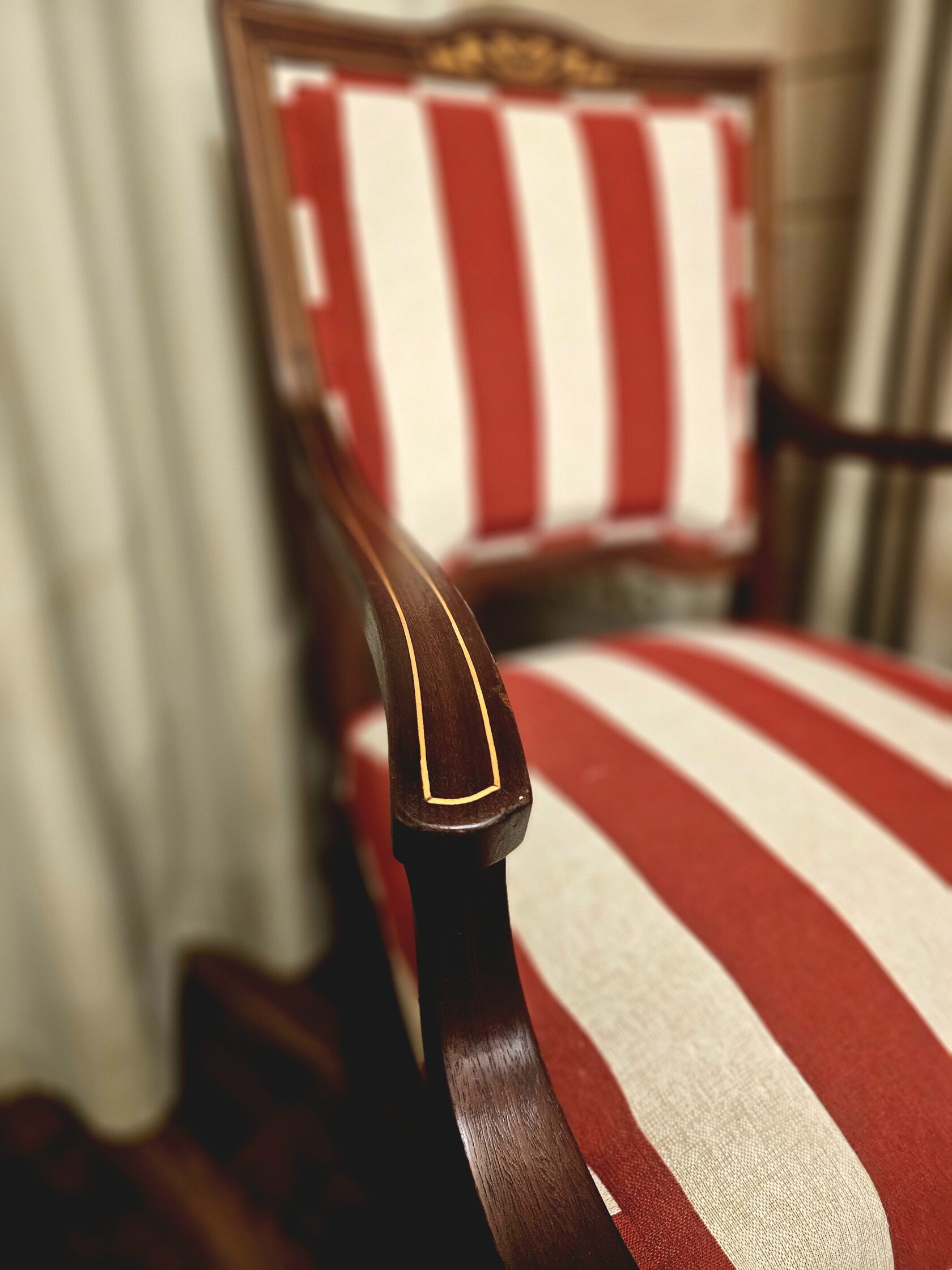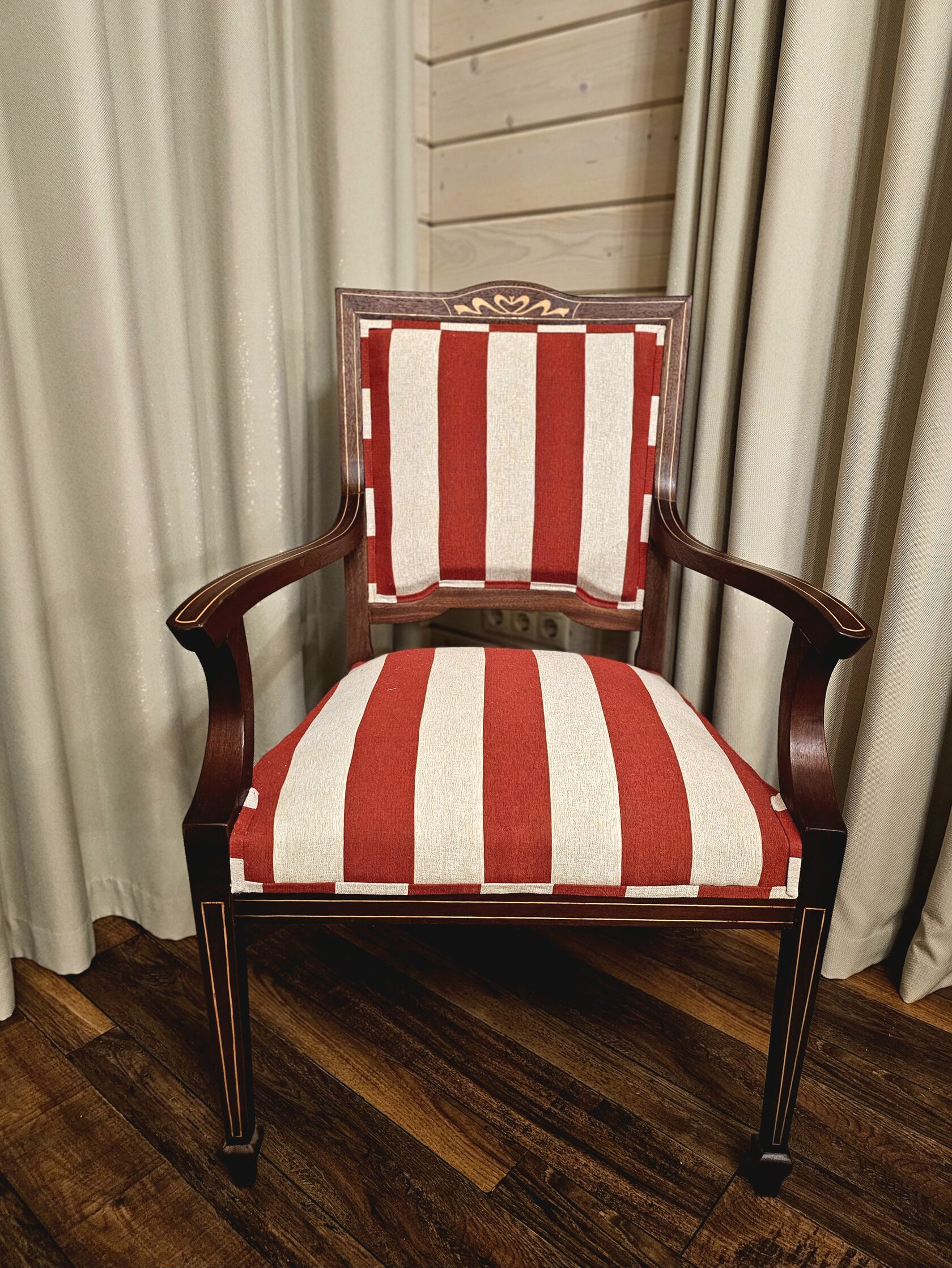 Антикварное, кабинетное кресло, конец 19 века, в стиле модерн. Красное дерево, инкрустация - груша. Проведена бережная реставрация по аутентичным традициям того времени, наполнение водоросли, пружины, ткань - гобелен.