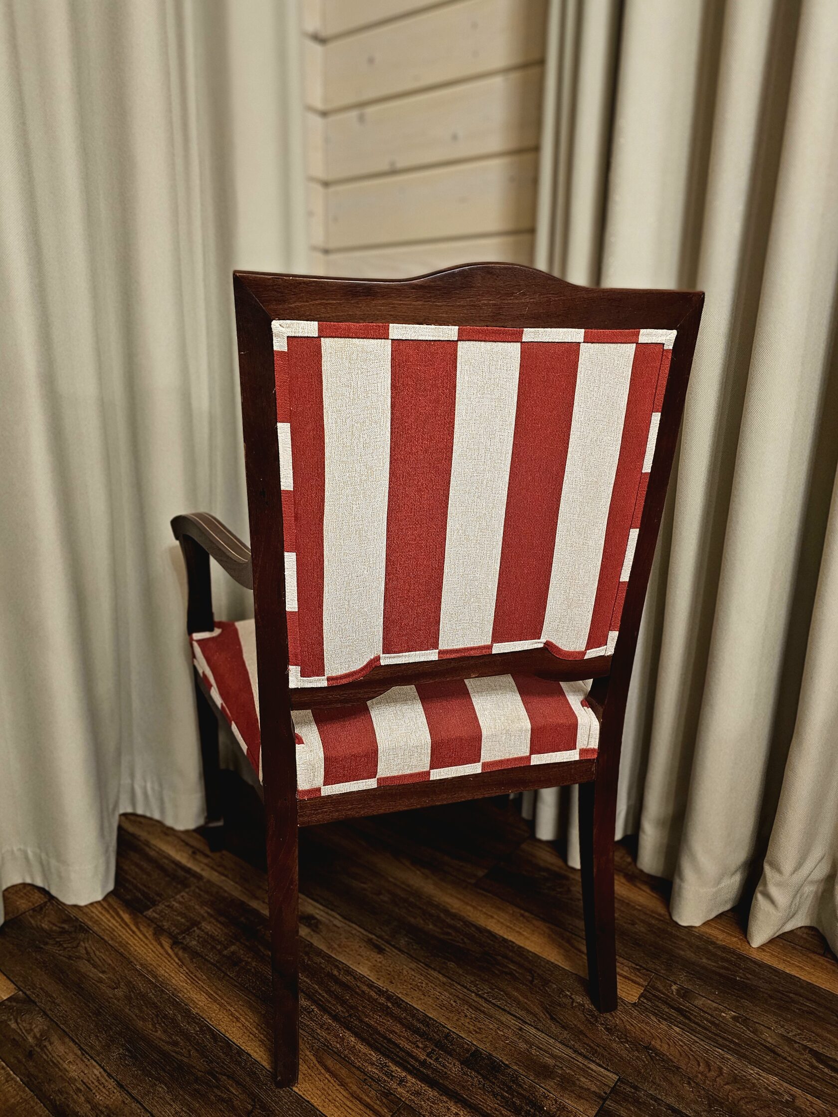 Антикварное кресло 19 век, после аккуратной реставрации. Реставрация по аутентичной технологии, антикварные пружины, водоросли, обивка европейской тканью – красный бархат. Передние ножки на колесиках. При реставрации обнаружены старинные отметки, автограф автора.